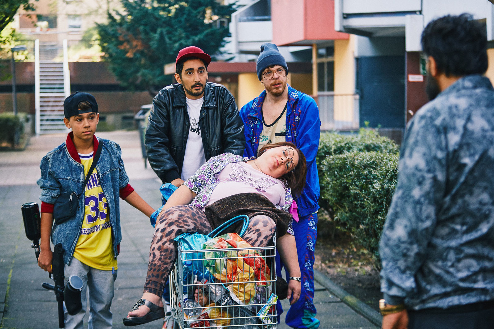 HundSol (Eko Fresh, 2.v.l.), Hardy (Sascha Reimann, 2.v.r.), Deniz (Levin AllIn, l.), Madita Berger (Martina Eitner-Acheampong, m.), Volkan (Kida Khodr Ramadan, r.)Bild: © ZDF und Efe Cetinoezman