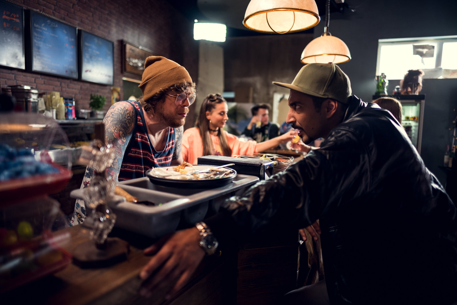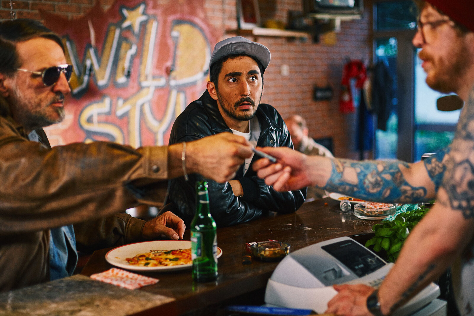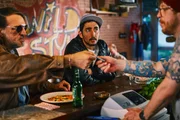 HochzeitHardy (Sascha Reimann, l.) hat Lisa (Cosima Hennmann, M.) in der Pizzeria eingestellt. Sol (Eko Fresh, r.) beschwert sich, dass Gorilla seinen Song geklaut hat.Bild: © ZDF und Efe Cetinoezman