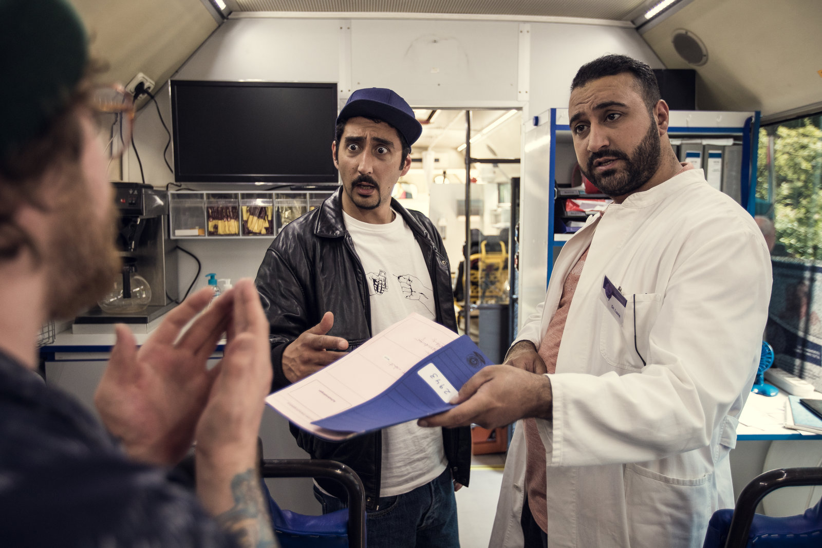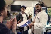 AbschiedIm Gesundheitsmobil: Sol (Eko Fresh, l.) und Dr. Luvis (Sami Nasser, r.), der Hardy (Sascha Reimann, l.) die Patientenakte übergibt.Bild: © ZDF und Efe Cetinoezman