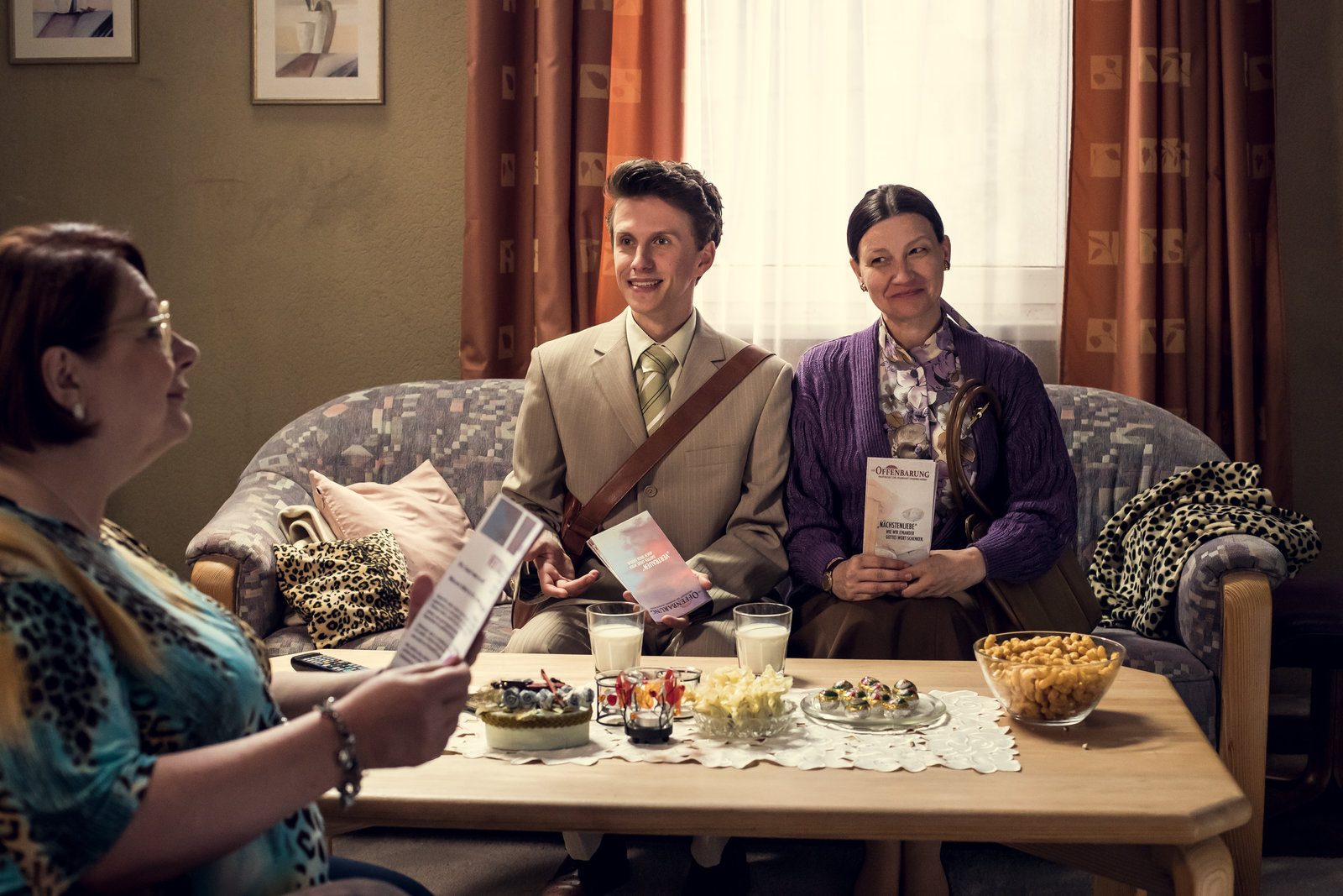 SchicksalFrau Bulut (Tina Ruland, r.) ist empört, weil Madita (Martina Eitner-Acheampong, M.) Deniz (Levin Alin, vorn rechts) von ihrer Religion überzeugen will. Im Hintergrund links: Herr Bulut (Aykut Kayacik, l.).Bild: © ZDF und Efe Cetinoezman