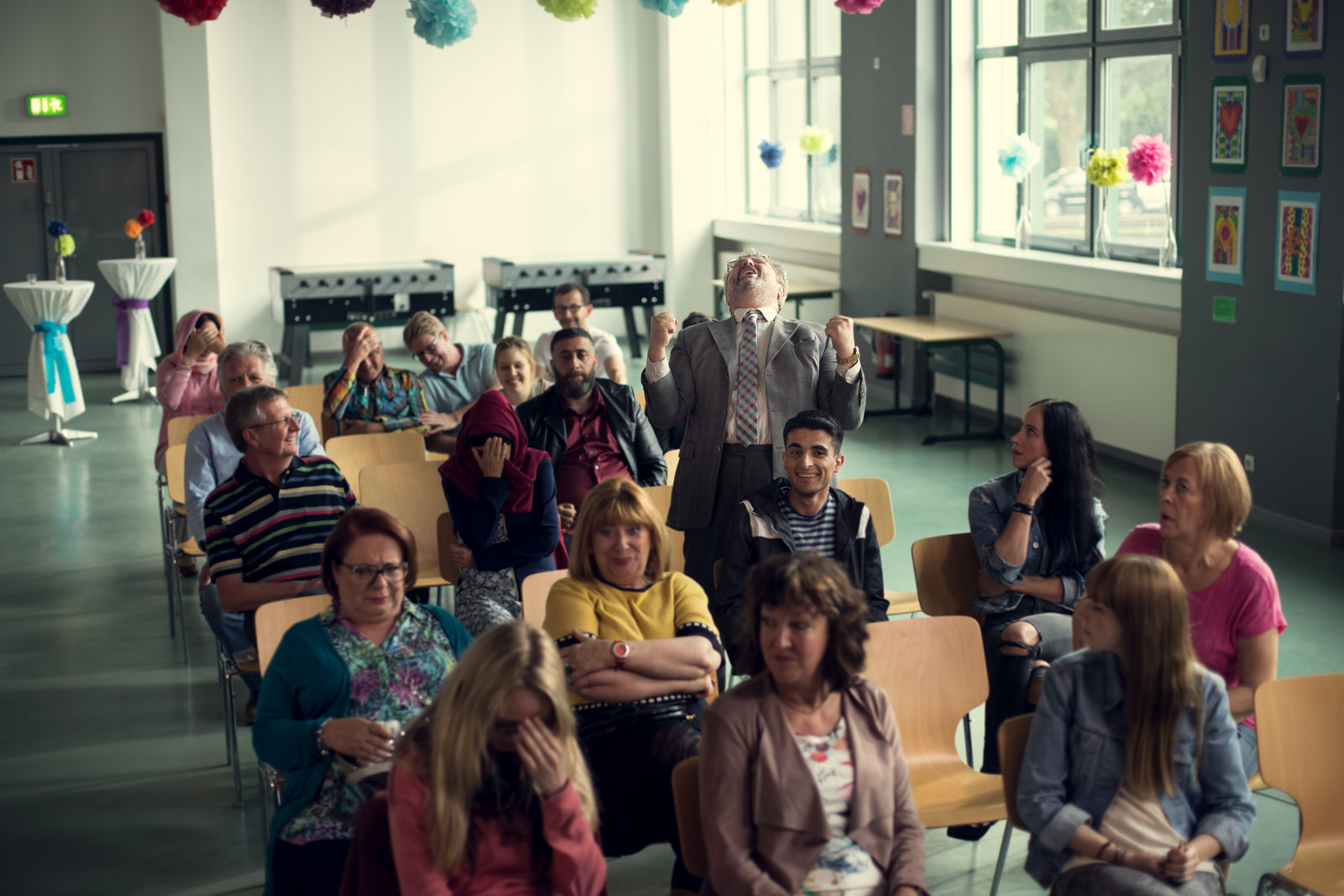 GeißbockWährend der Schultheateraufführung: Herr Bulut (Aykut Kayacik) springt freudig aus dem Publikum auf.Bild: © ZDF und Efe Cetinoezman