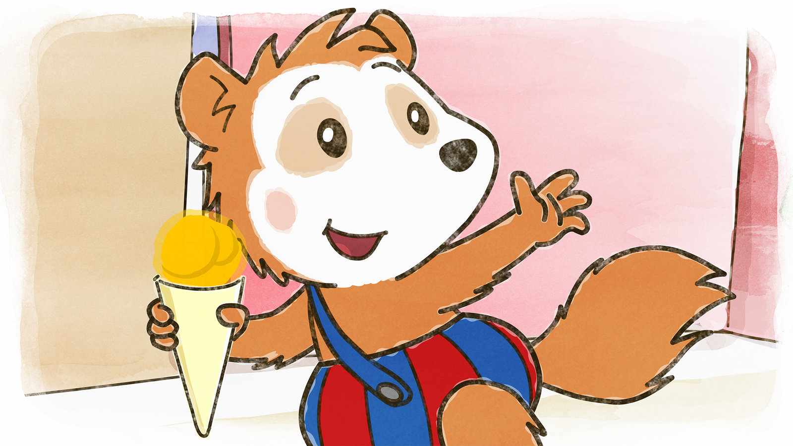 Bobo geht Eis essenMit einem Eis in der Hand verabschiedet sich Bobo aus der Eisdiele.Bild: © JEP ANIMATION/WDR