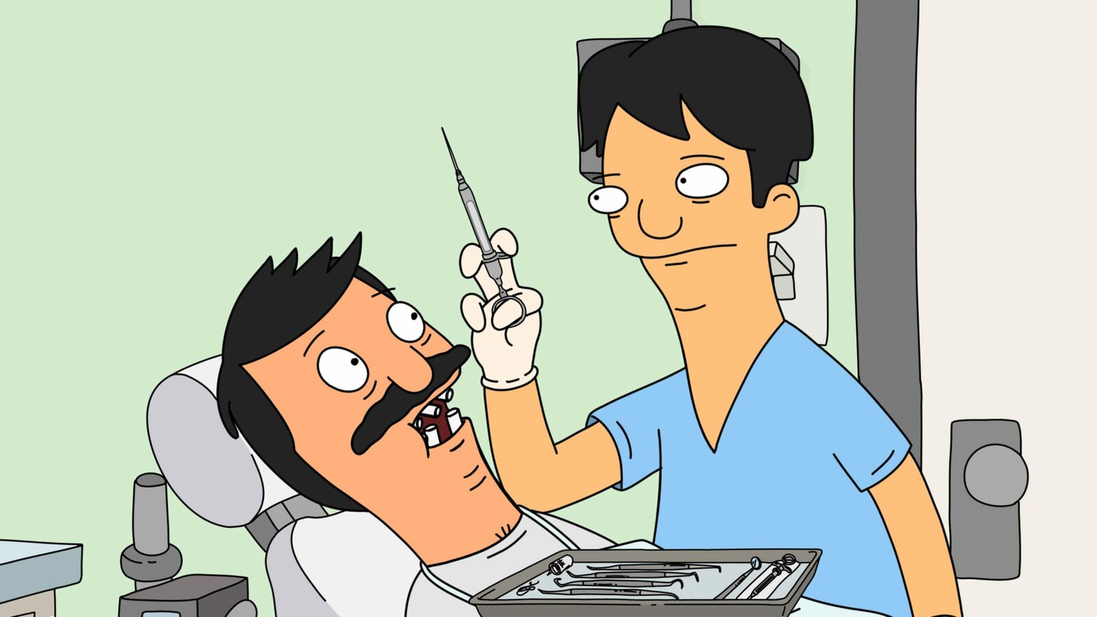 Dr. YapProbleme stehen ins Haus: Lindas Schwester Gayle holt Bob (l.) von Dr. Yap (r.), dem Zahnarzt, ab. Unter Medikamenteneinfluss hält Bob Gayle für Linda und küsst sie ...Bild: © ViacomCBS / FOX / 2012 FOX BROADCASTING / TCFFC ALL RIGHTS RESERVED.