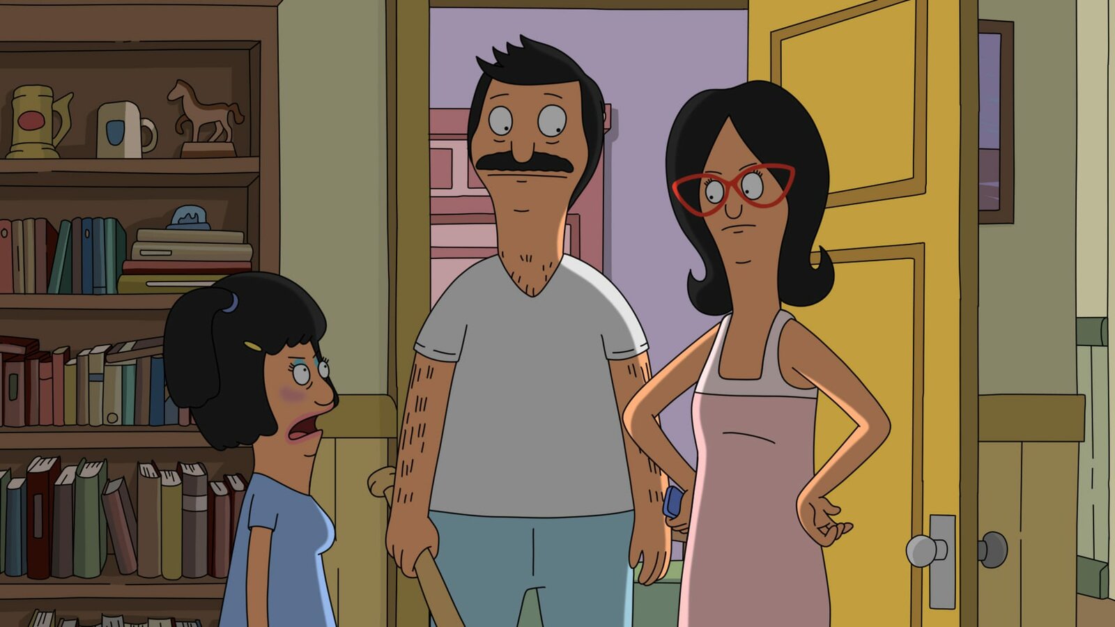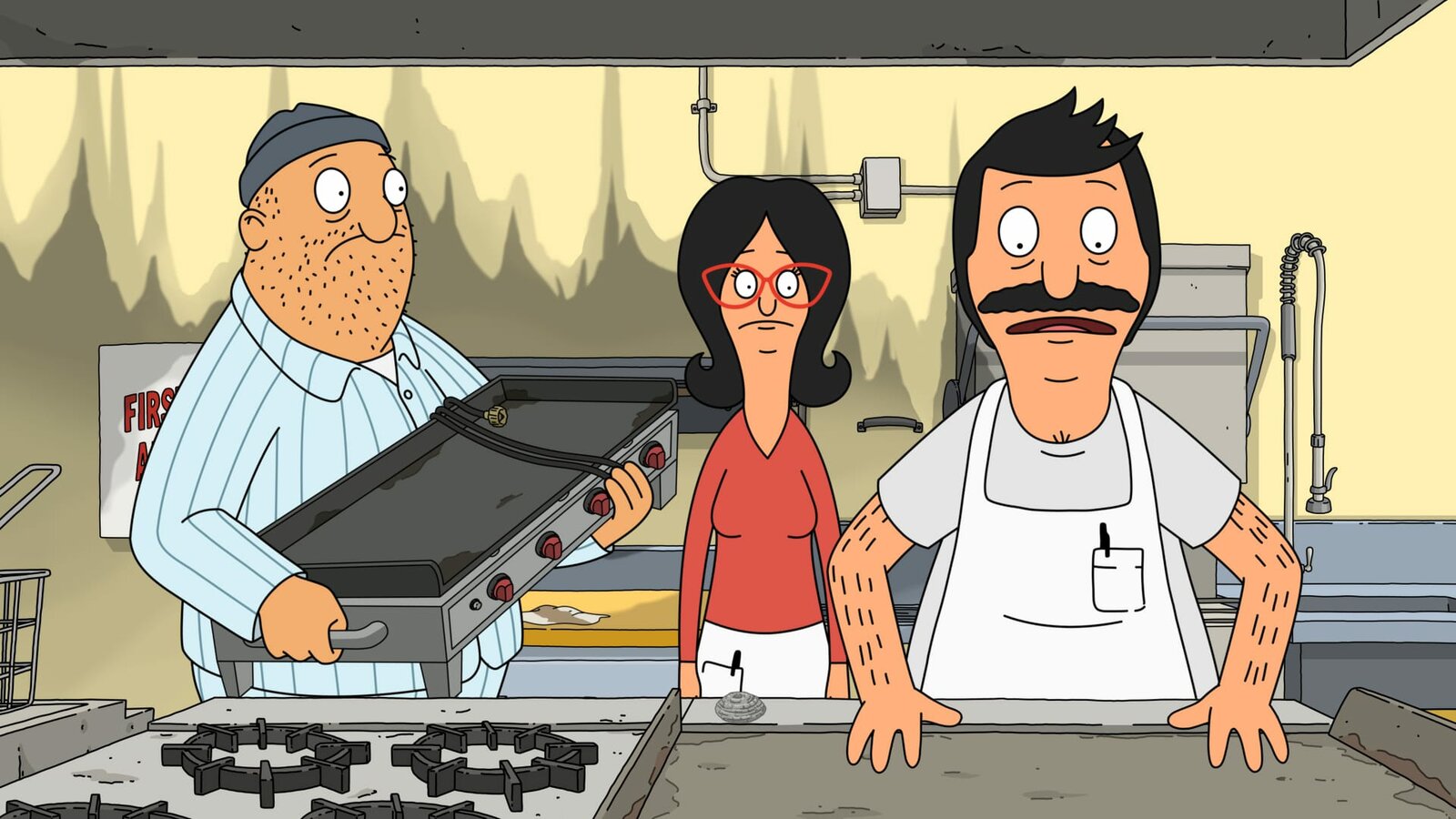 Bob Belcher und die furchtbaren KinderL-R: Teddy, Linda, BobBild: © ViacomCBS / BOB'S BURGERS © 2020 by Twentieth Century Fox Film Corporation.