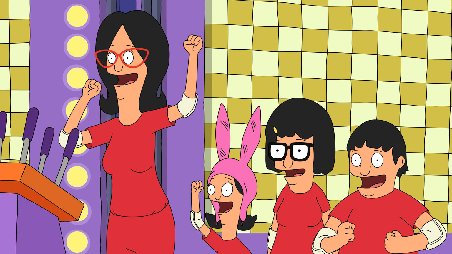 Truthahn-TerrorL-R: Linda, Gene, Louise, Gayle und Tina.Bild: © ViacomCBS / FOX / 2013 FOX BROADCASTING / BOB'S BURGERS ª and 2013 TCFFC ALL RIGHTS RESERVED.