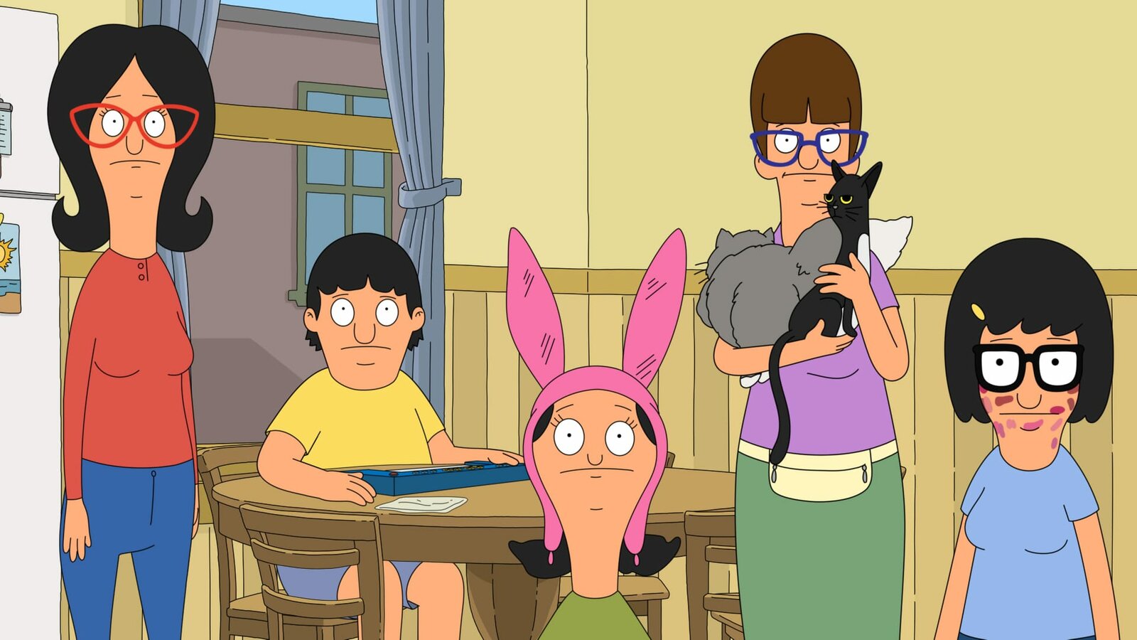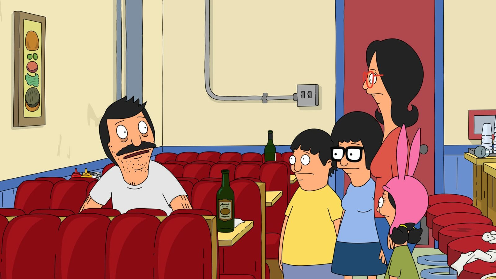 Der geheime VerehrerL-R: Bob, Gene, Tina, Linda, LouiseBild: © ViacomCBS / FOX / FOX BROADCASTING / BOB'S BURGERS ? and TCFFC ALL RIGHTS RESERVED