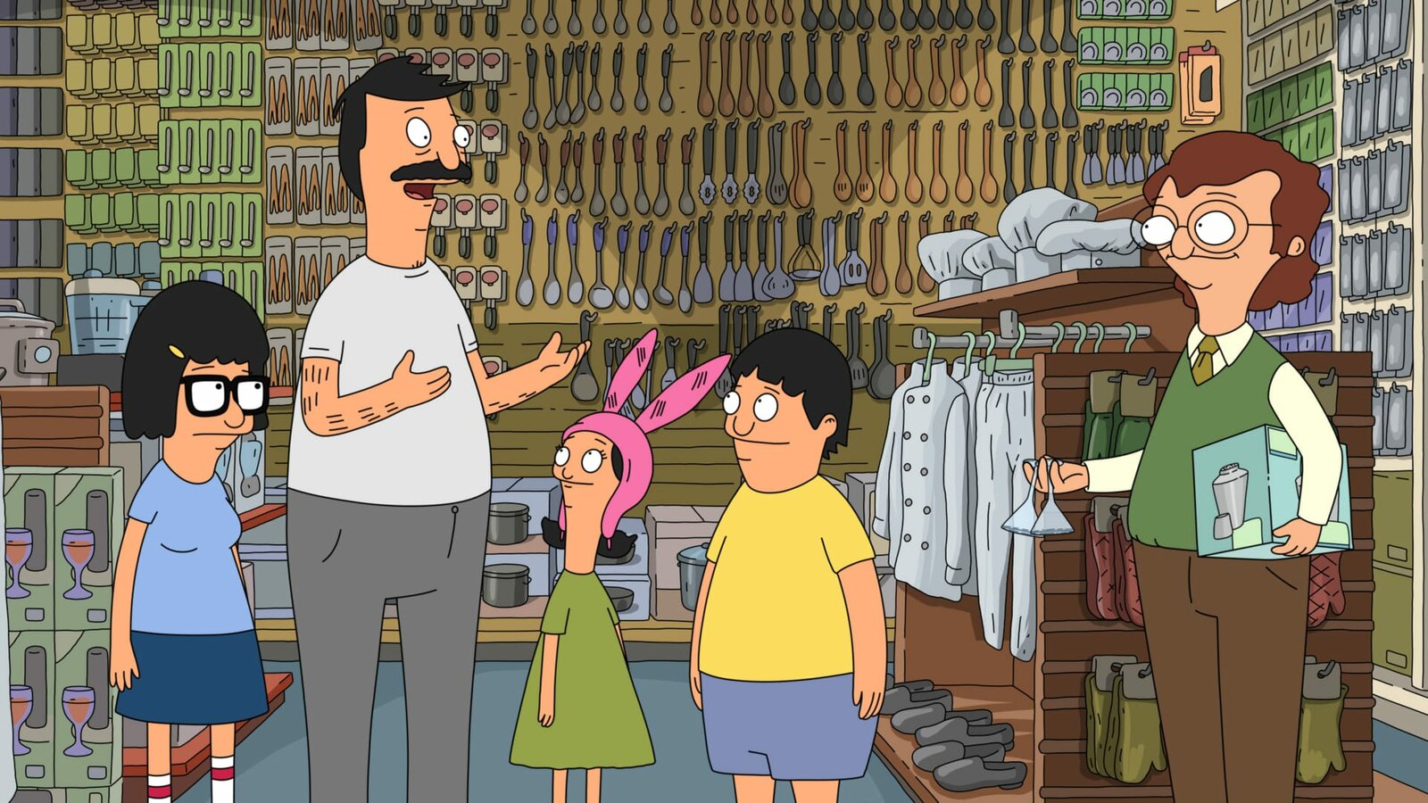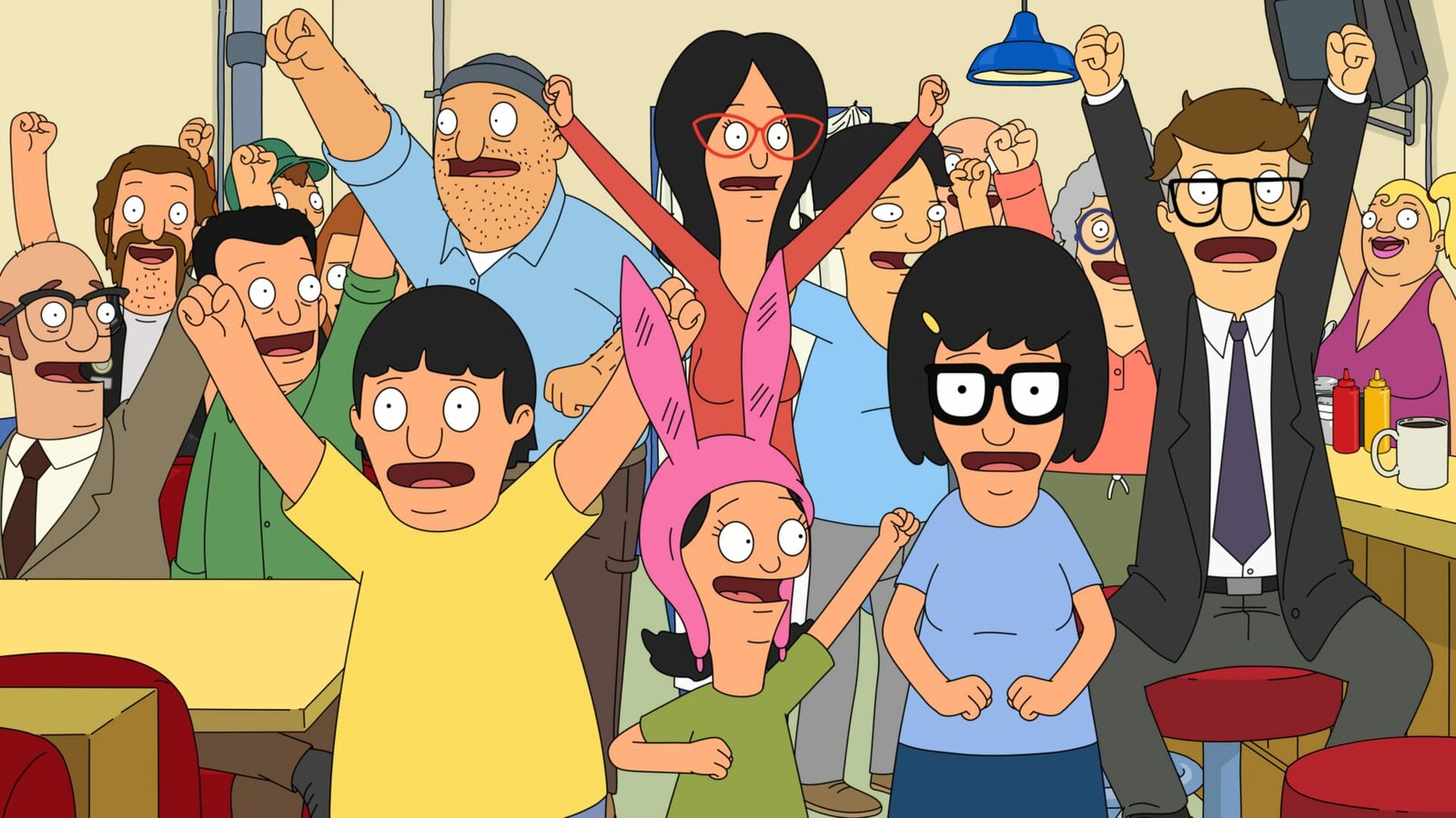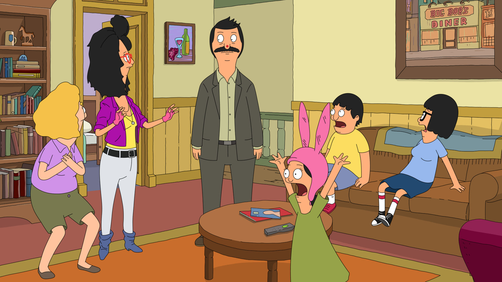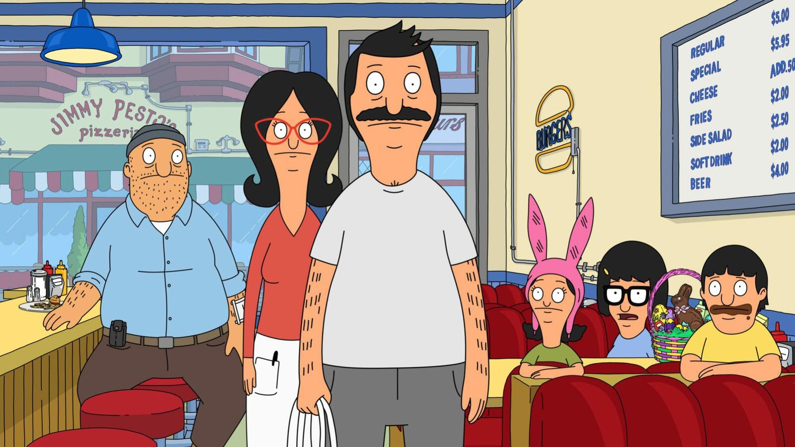 Super-WerbungL-R: Linda, Bob, Louise, Teddy, Mort, Gene, Tina.Bild: © ViacomCBS / FOX / FOX BROADCASTING / BOB'S BURGERS and 2014 TCFFC ALL RIGHTS RESERVED.
