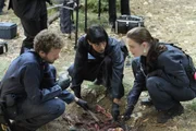 Die Wendung in der HandlungBONES: Brennan (Emily Deschanel, R), Cam (Tamara Taylor, C) and Hodgins (TJ Thyne, L) investigate the remains of two bodies that were found at the same burial plot in the "The Twist in the Plot" episode of BONES airing Monday, Jan. 28 (8:00-9:00 PM ET/PT) on FOX. ©2013 Fox Broadcasting Co. CR: Patrick McElhenney/FOX Bones_Ep808_sc_5_0140Bild: © ATV