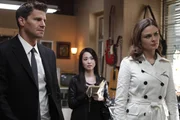 Der Kopf des KopfgeldjägersBooth (David Boreanaz) und Brennan (Emily Deschanel, re.) werden bei ihren Ermittlungen von Riku Iwanaga (Seiko Matsuda) begleitet, die eine Reportage über die Buchautorin Brennan machen will.Bild: © Copyright: Greg Gayne