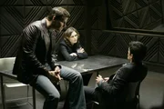 Die junge Frau im KronleuchterBooth (David Boreanaz, L) and Brennan (Emily Deschanel, C) question a suspect (Andres Londono, R) when a young woman is found burned to death in a hotel fire in the BONES episode "The Girl in Suite 2103".Bild: © ATV