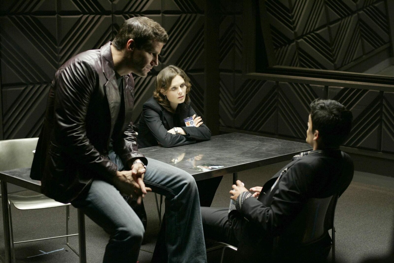 Booth und Bones und das gebrochene HerzBONES: Brennan (Emily Deschanel, R) and Booth (David Boreanaz, C) interview a suspect (guest star Kathleen York, L) in the murder of a state department accountant, whose remains were found in a hotel air conditioning unit in the "The Secrets in the Proposal" season premiere episode of BONES airing Monday, Sept. 16 (8:00-9:00 PM ET/PT) on FOX. ©2013 Fox Broadcasting Co. Cr: Ray Mickshaw/FOX Bones_EP901_SecretInTheProposal_Sc30_0208Bild: © ATV