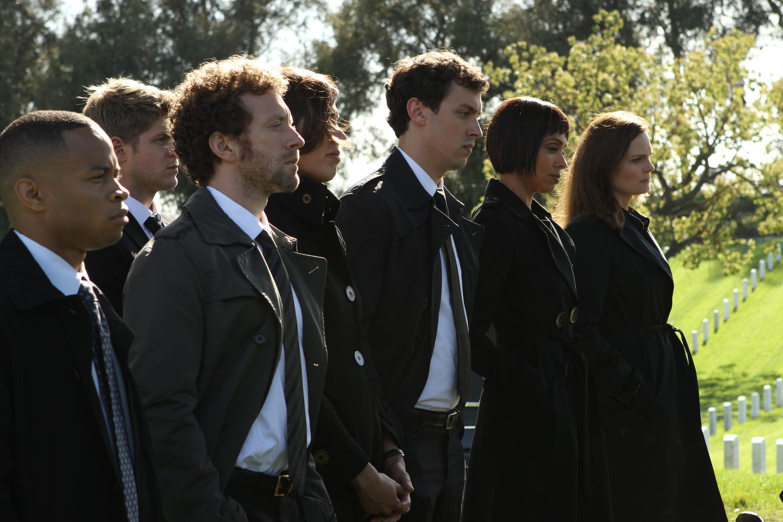Das Leben der wartenden TotenBU: (v.li.): Dr. Clark Edison (Eugene Byrd), Wendell Bray (Michael Grant Terry), Dr. Jack Hodgins (T. J. Thyne), Angela Montenegro (Michaela Colin), Dr. Camille Saroyan (Tamara Taylor) und Dr. Temperance "Bones" Brennan (Emily Deschanel)BB: achte Staffel, OT: The Patriot in the Purgatory Bones_Ep714_The_Patriot_in_Purgatory_sc_29_0303Bild: © ATV
