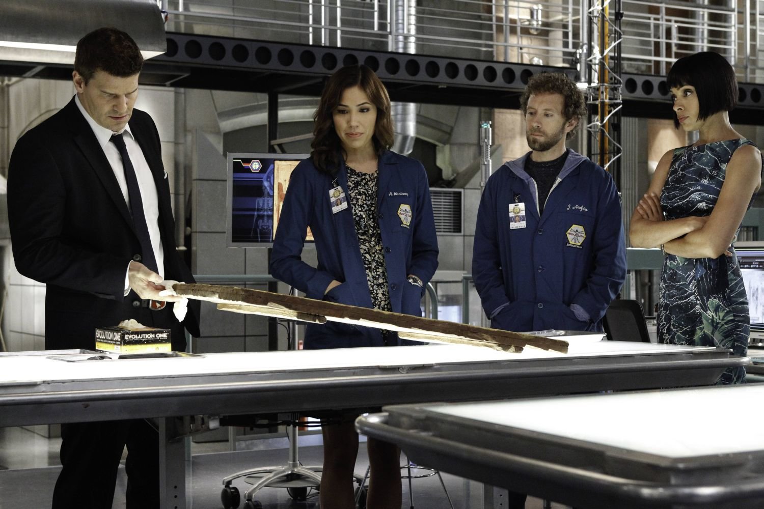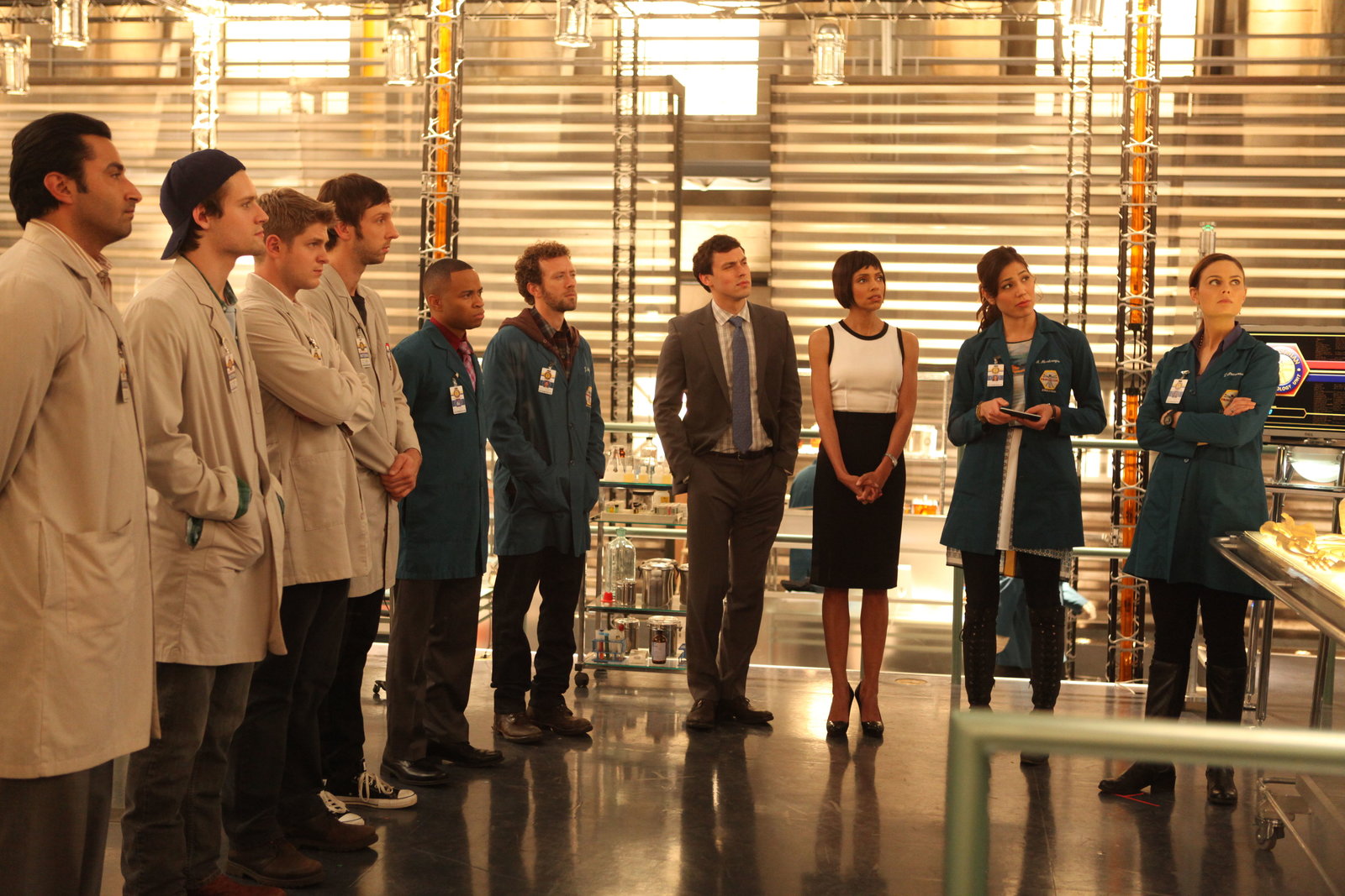 Das Leben der wartenden TotenBU: (v.li.): Arastoo Vaziri (Pej Vahdat), Finn Abernathy (Luke Kleintank), Wendell Bray (Michael Grant Terry), Colin Fisher (Joel David Moore), Dr. Clark Edison (Eugene Byrd), Dr. Jack Hodgins (T. J. Thyne), Dr. Lance Sweets (John Francis Daley), Dr. Camille Saroyan (Tamara Taylor), Angela Montenegro (Michaela Colin) und Dr. Temperance "Bones" Brennan (Emily Deschanel).BB: achte Staffel, OT: The Patriot in the Purgatory Bones_Ep714_The_Patriot_in_Purgatory_sc_28_0310Bild: © ATV