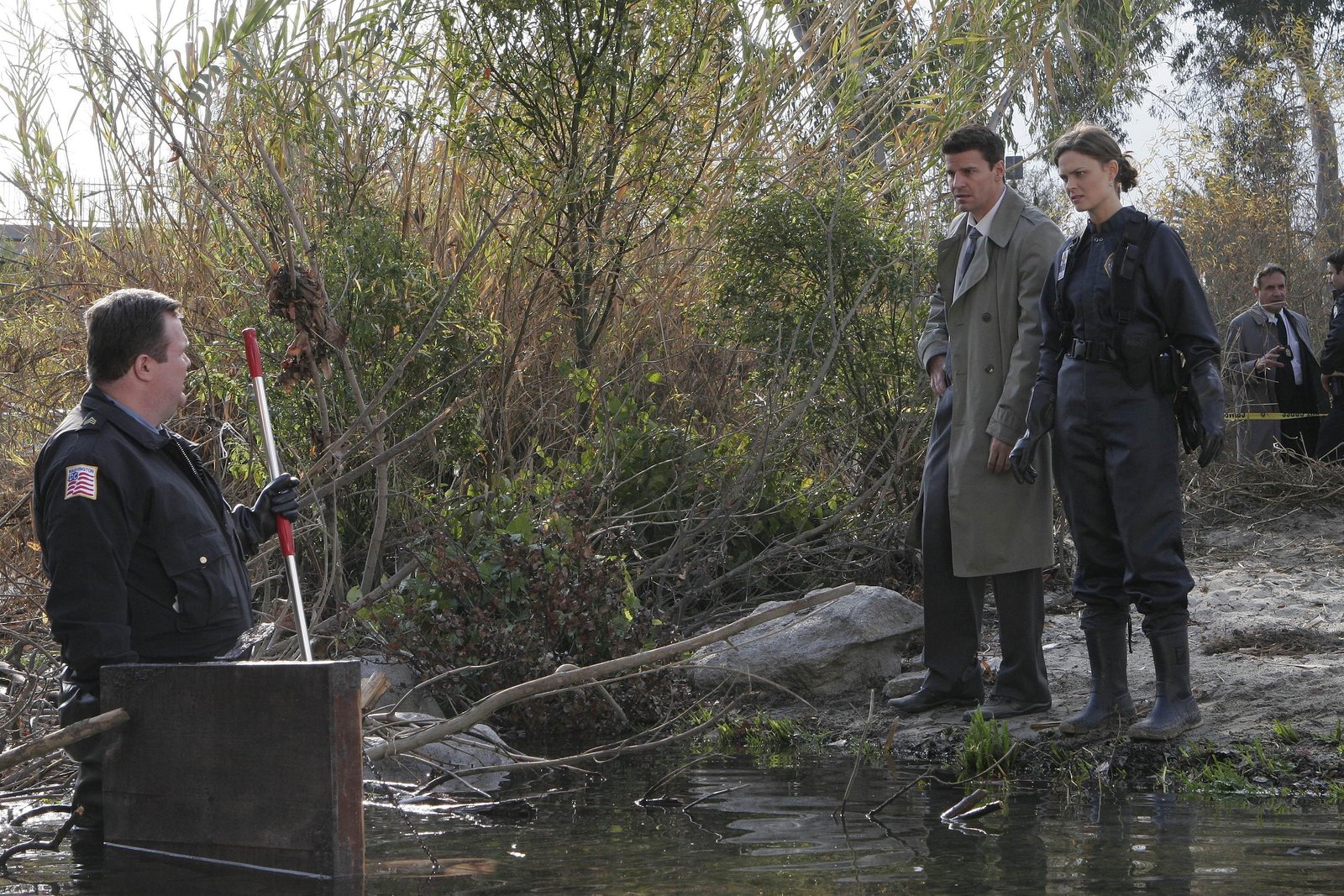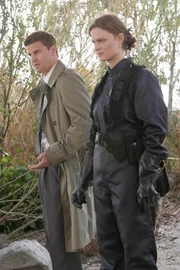 Ein Medium für die Liebe und den TodBooth (David Boreanaz) und Brennan (Emily Deschanel) untersuchen den Tatort, an dem eine Frau - ohne Knochen und in einer Kiste verpackt - im Fluss gefunden wurde.Bild: © W9
