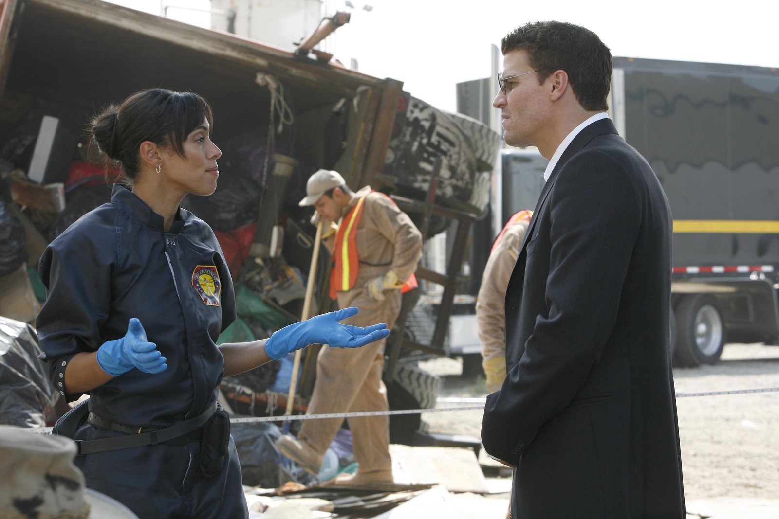 Ein Zwerg, reich und tot, war einmal in NotCamille (Tamara Taylor) und Booth (David Boreanaz) am Tatort, an dem ein umgestürzter Müllwagen seine schauerliche Fracht preisgegeben hat: die völlig verweste Leiche des seit drei Wochen vermissten jugendlichen Dylan.Bild: © TV4
