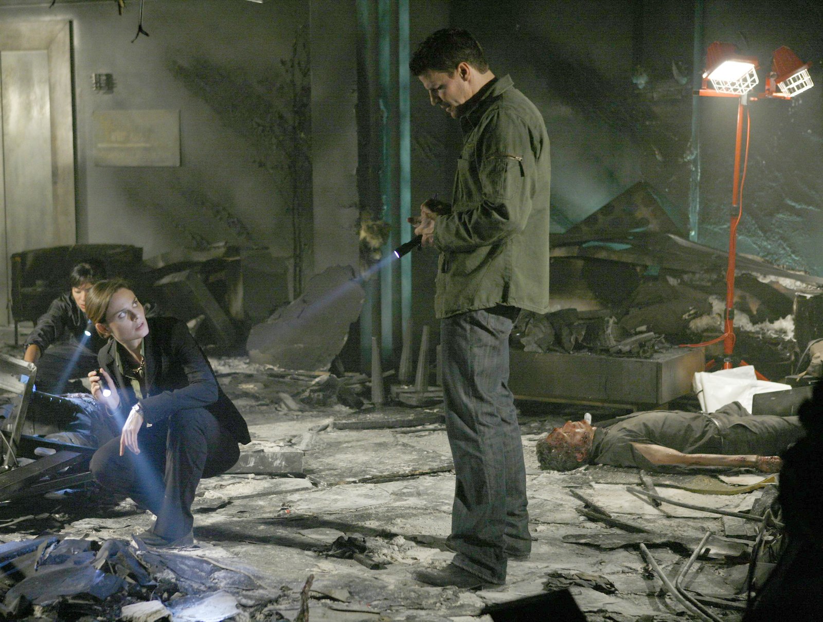 Die junge Frau im KronleuchterBooth (David Boreanaz, R) and Brennan (Emily Deschanel, L) investigate the death of a young woman burned to death in a hotel fire in the BONES episode "The Girl in Suite 2103".Bild: © 4+