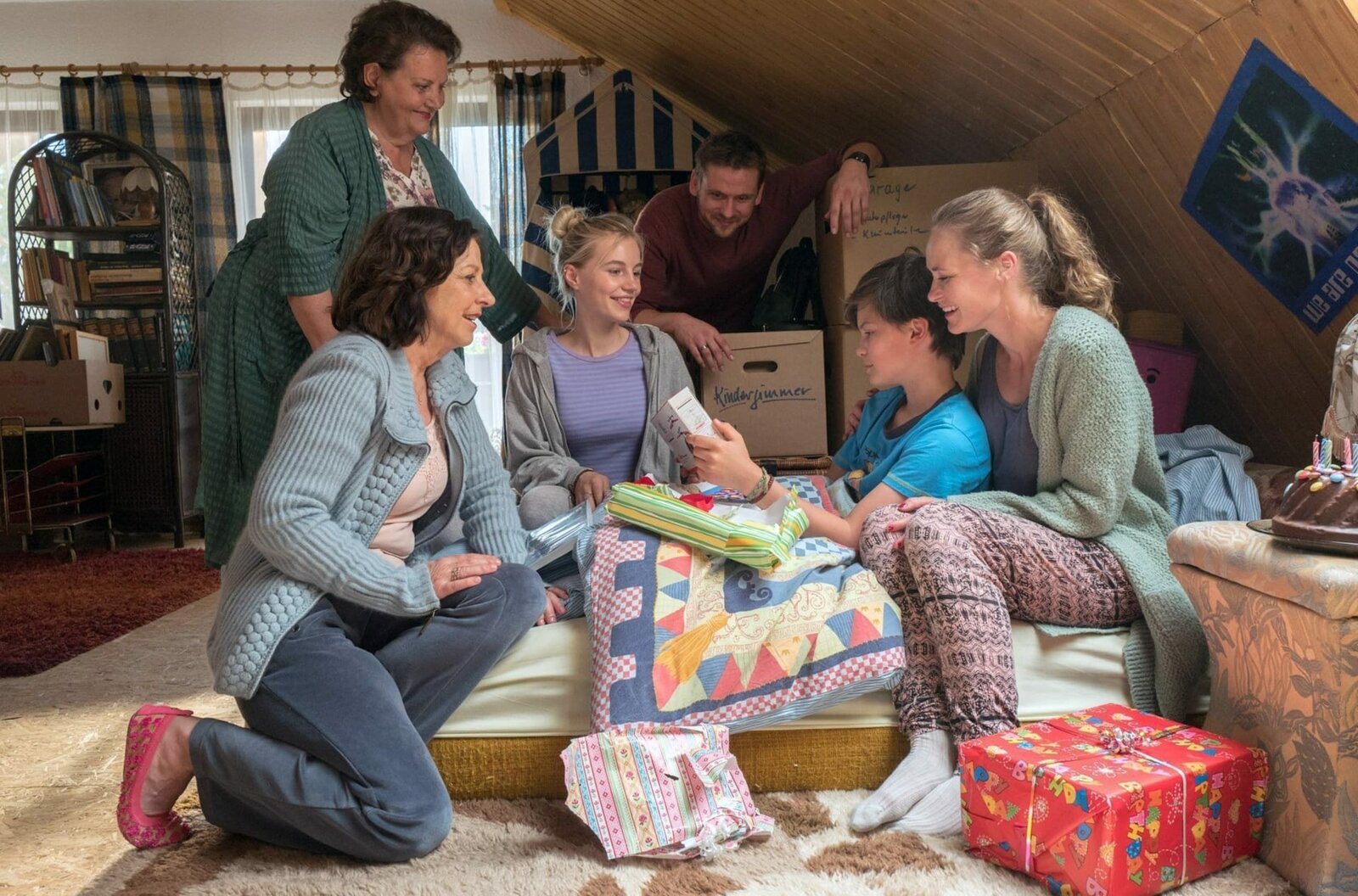 Kapitel 1Eddie (Fillin Mayer) wird von seiner Familie am Morgen seines Geburtstags geweckt. Von links: Biggi (Swetlana Schönfeld), Püppchen (Irene Rindje), Bianca (Louise S. Arnold), Martin (Steve Windolf), Eddi (Fillin Mayer) und Lisa (Inez B. David).Bild: © BR/good friends Filmproduktion/MDR/SWR/Oliver Vaccaro