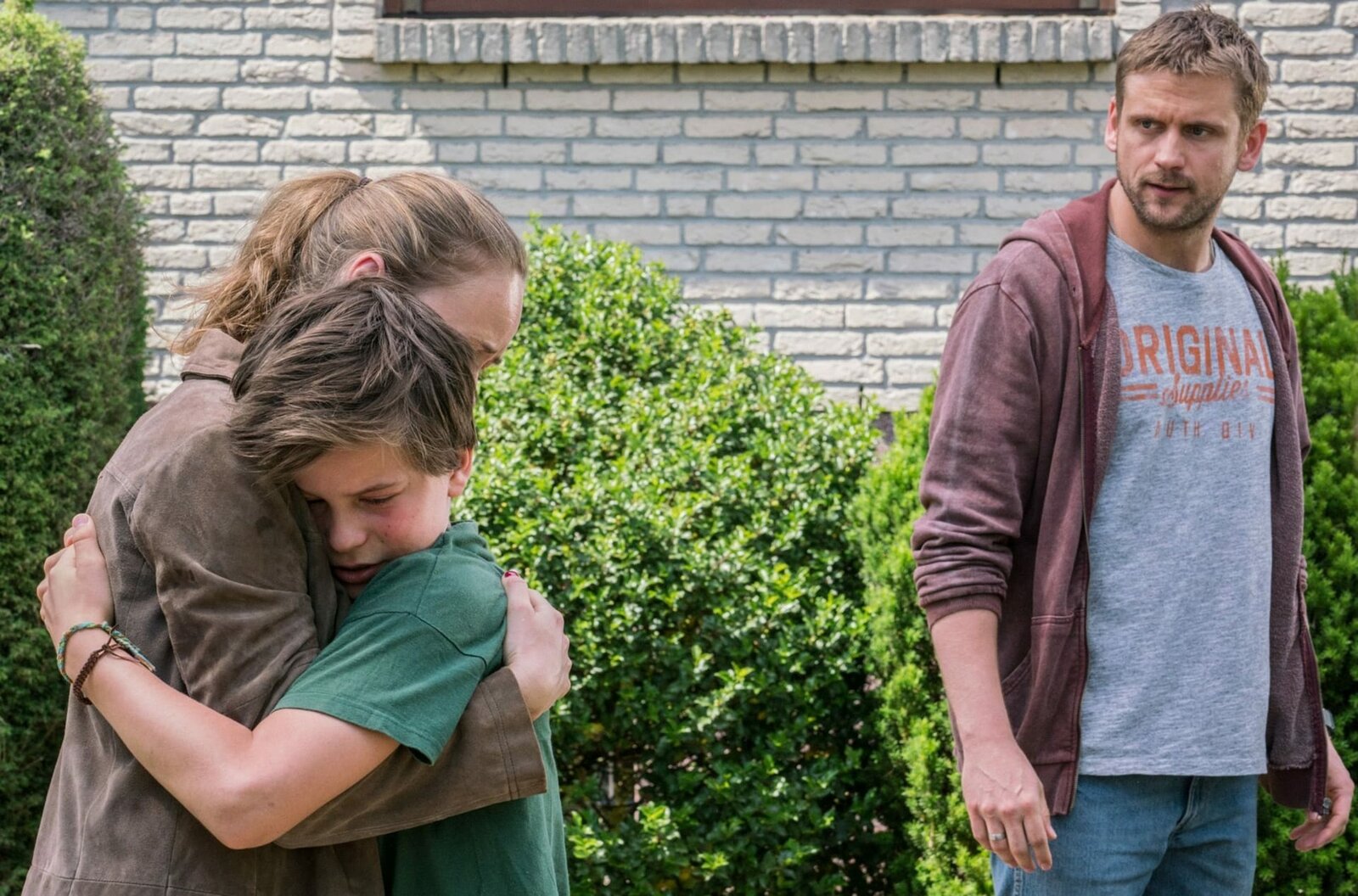 Kapitel 2Lisa (Inez B. David) versöhnt sich mit Eddie (Fillin Mayer). Von links: Lisa (Inez B. David), Eddie (Fillin Mayer) und Martin (Steve Windolf).Bild: © BR/good friends Filmproduktion/MDR/SWR/Oliver Vaccaro