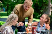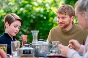 Gemeinsames Familienessen im Garten, bei dem jeder von seinem Tag erzählen soll ... von links: Bianca (Louise Sophie Arnold), Patrick (Lucas Prisor) und Lisa (Inez B. David).Bild: © BR/good friends Filmproduktion/MDR/SWR/Oliver Vaccaro