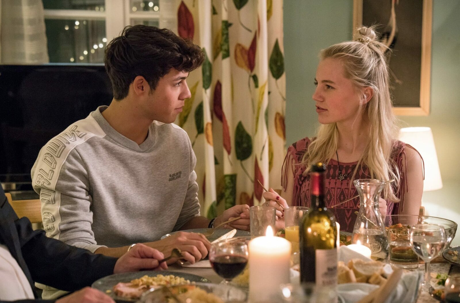 Das Familienessen dreht sich um Eddies Erza?hlung von Hundekacke ... Von links: William (Levis Kachel), Patrick (Lucas Prisor) und Bianca (Louise S. Arnold).Bild: © BR/good friends Filmproduktion/MDR/SWR/Oliver Vaccaro