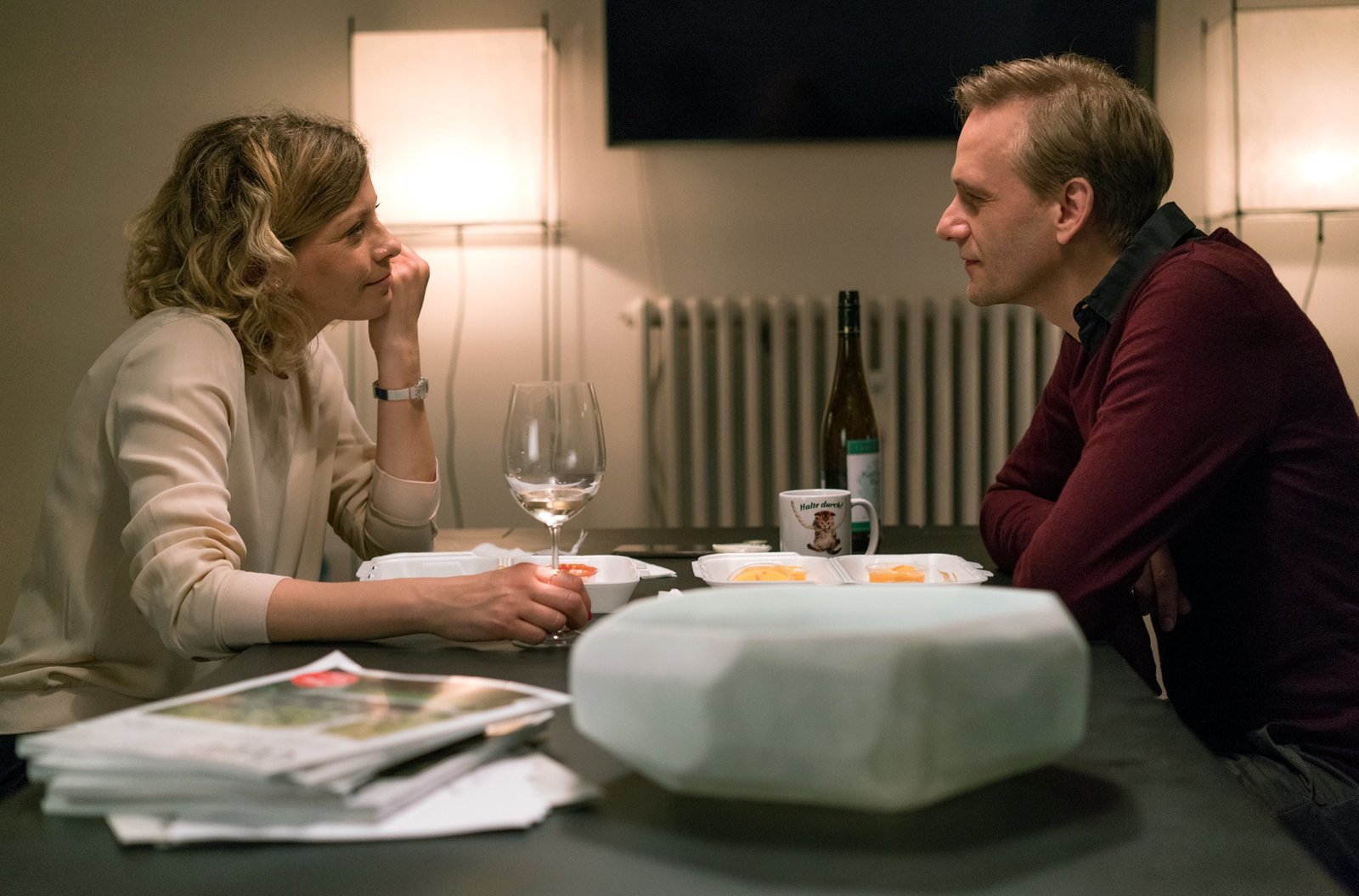 Katja (Anna Schäfer) und Hendrik (Matthias Lier) essen im Büro.Bild: © BR/good friends Filmproduktion/MDR/SWR/Oliver Vaccaro