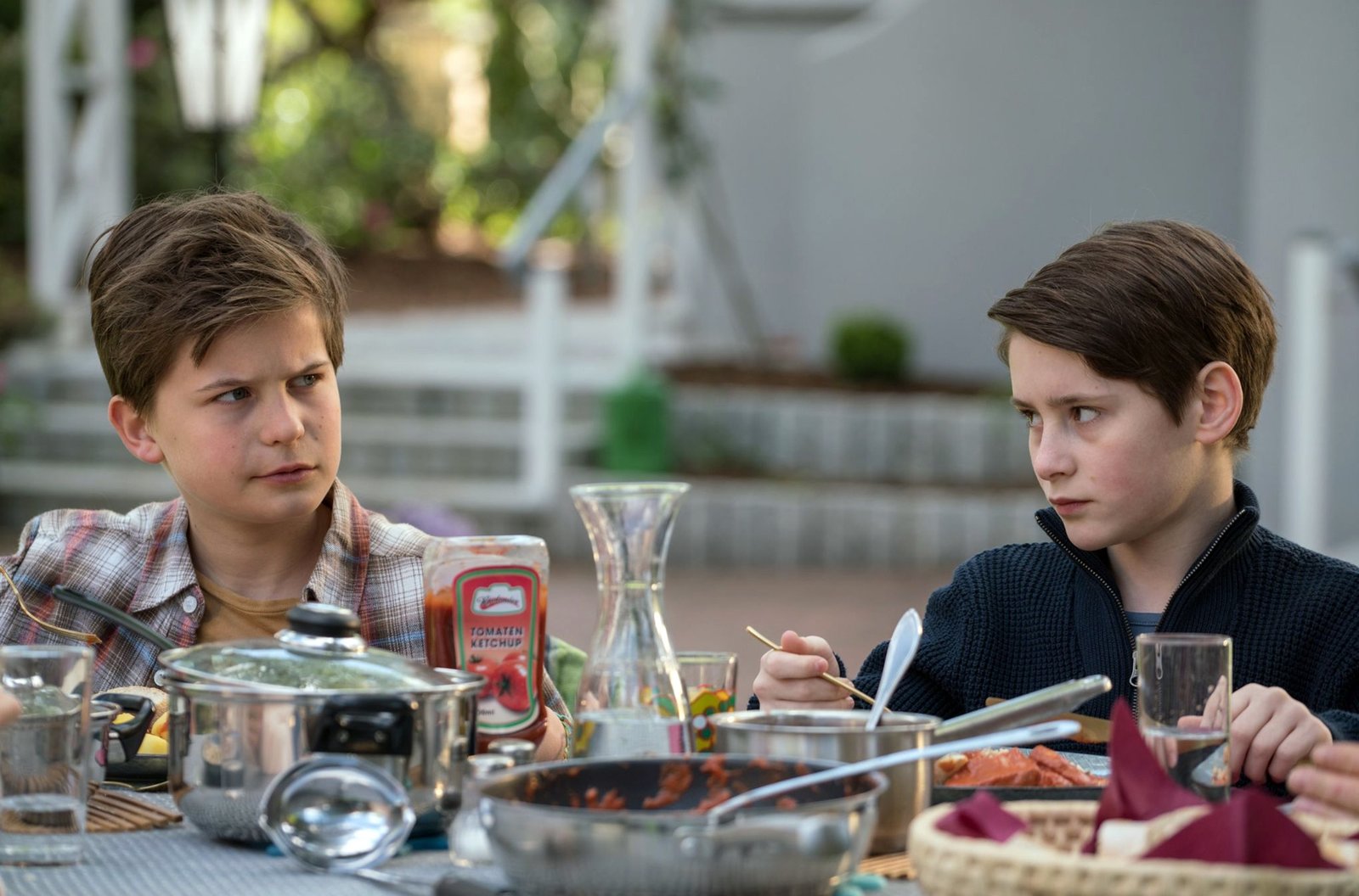 Von links: Eddie (Fillin Mayer) erzählt beim Essen über die Hundekacke. William (Levis Kachel) findet das einfach nur eklig.Bild: © BR/good friends Filmproduktion/MDR/SWR/Oliver Vaccaro