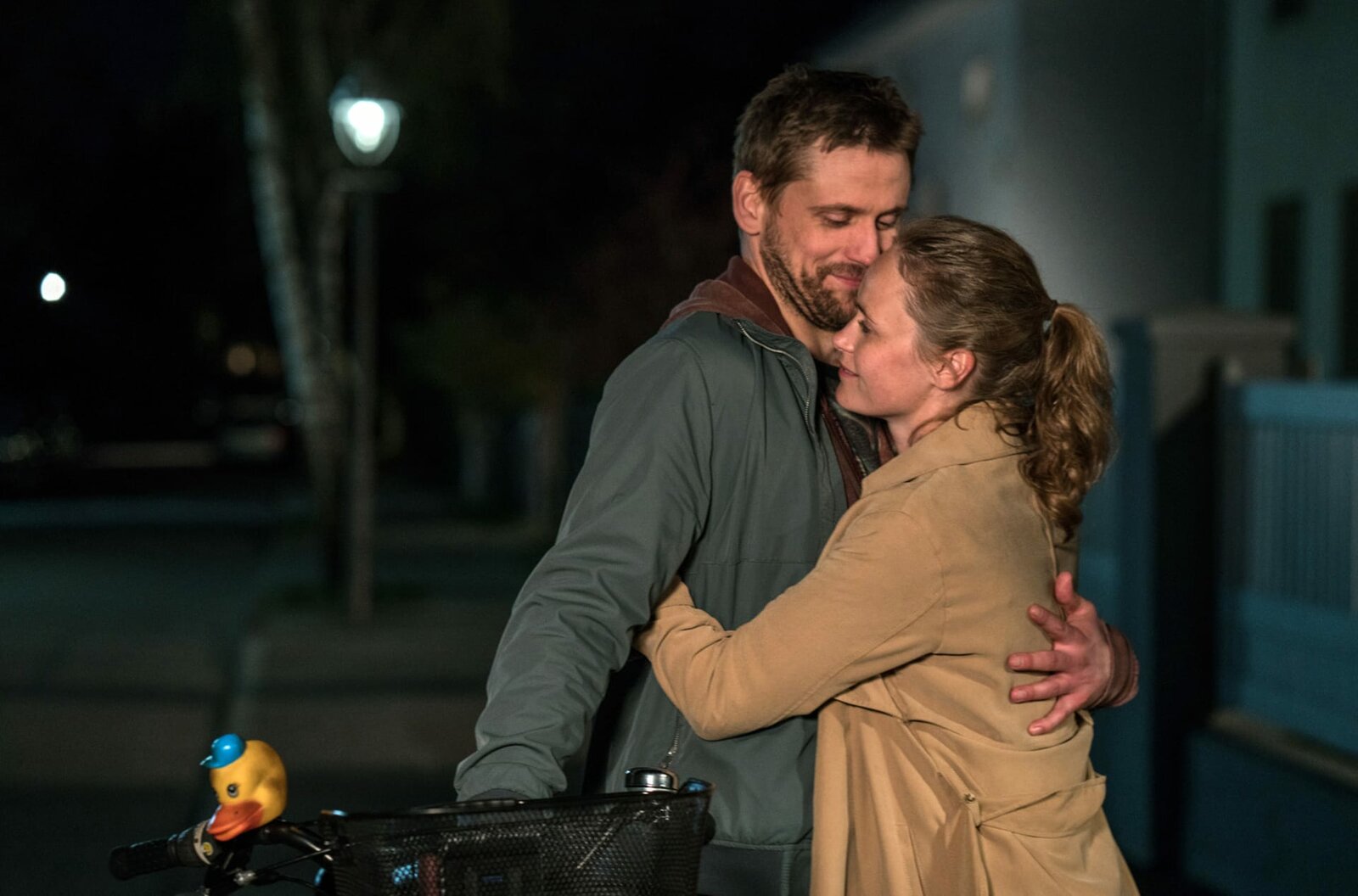 Martin (Steve Windolf) und Lisa (Inez B. David) verabschieden sich nach einem gemeinsamen Elternabend.Bild: © HR/BR/good friends Filmproduktion/MDR/SWR/Oliver Vaccaro