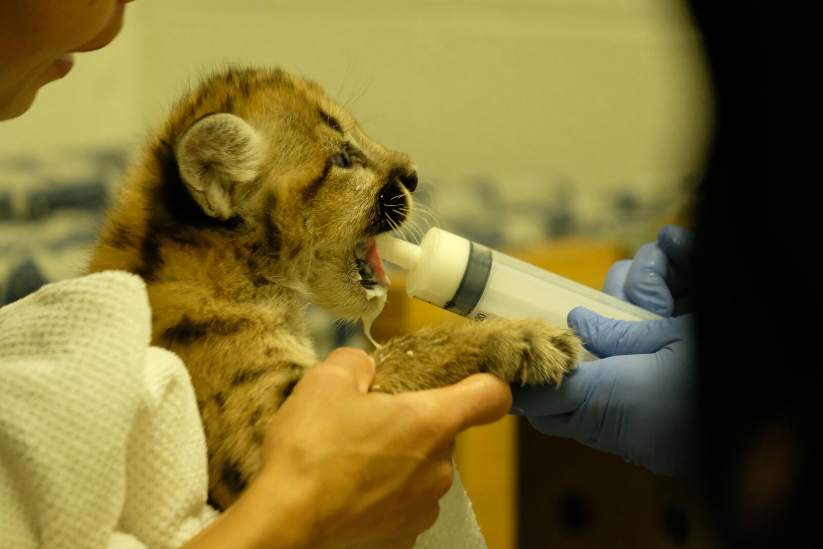 Ein Spielzeug für den AmeisenbärenBaby cheetah drinks from a bottle.Bild: © Discovery Communications, LLC