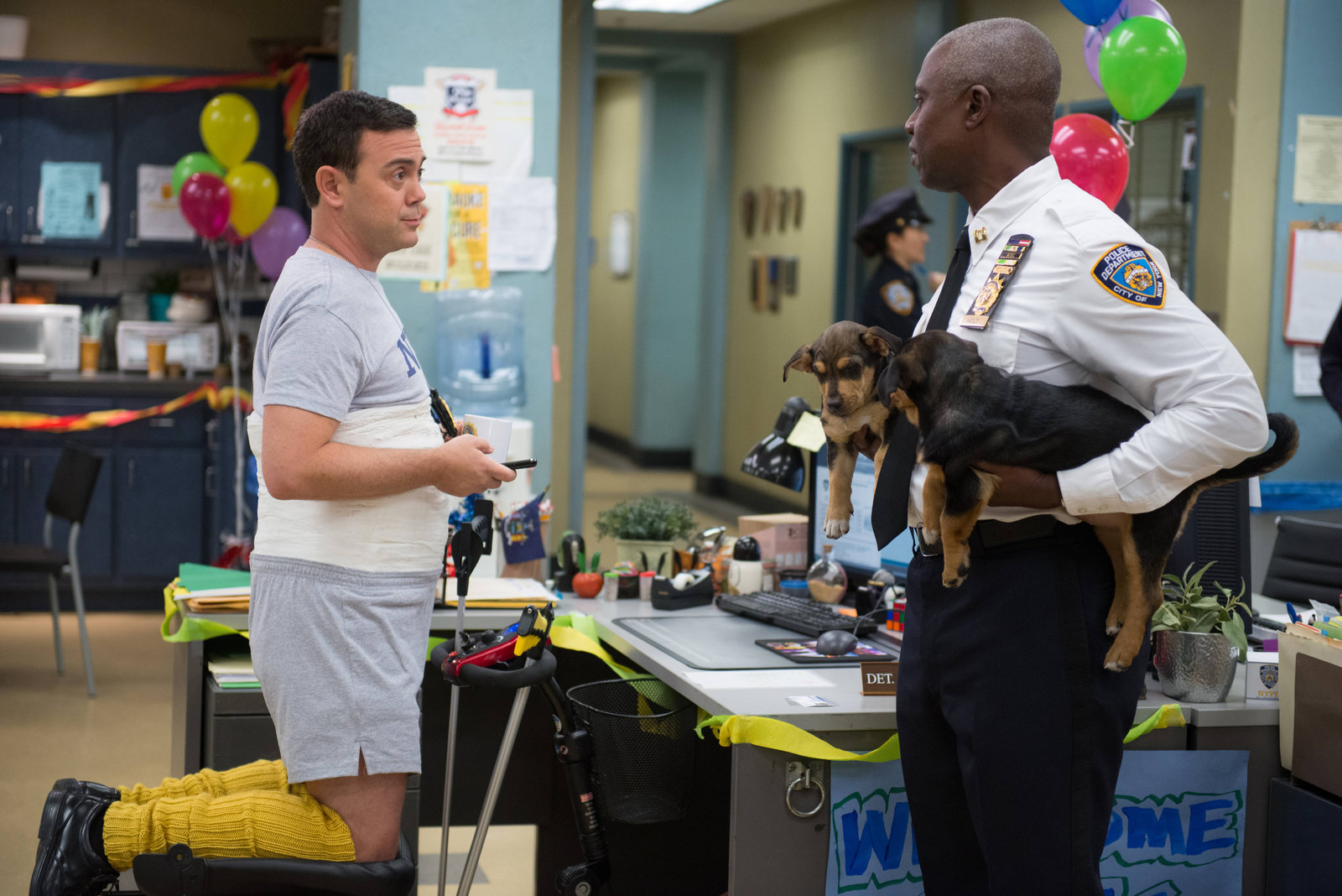 Es wird Zeit, dass wir abrechnenDie Schulden abgearbeitet: Joe Lo Truglio (stehend) als Charles Boyle, Andy Samberg als Jake PeraltaBild: © SRF/NBC Studios LLC.