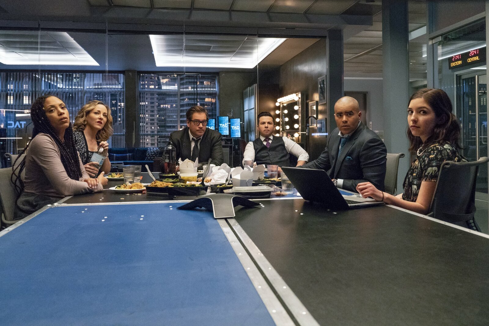 Das Urteil(v.l.n.r.) Danny James (Jaime Lee Kirchner); Marissa Morgan (Geneva Carr); Dr. Jason Bull (Michael Weatherly); Benny Colón (Freddy Rodriguez); Chunk Palmer (Chris Jackson); Cable McCrory (Annabelle Attanasio)Bild: © 2018 CBS Broadcasting, Inc. All Rights Reserved. / David Giesbrecht Lizenzbild frei
