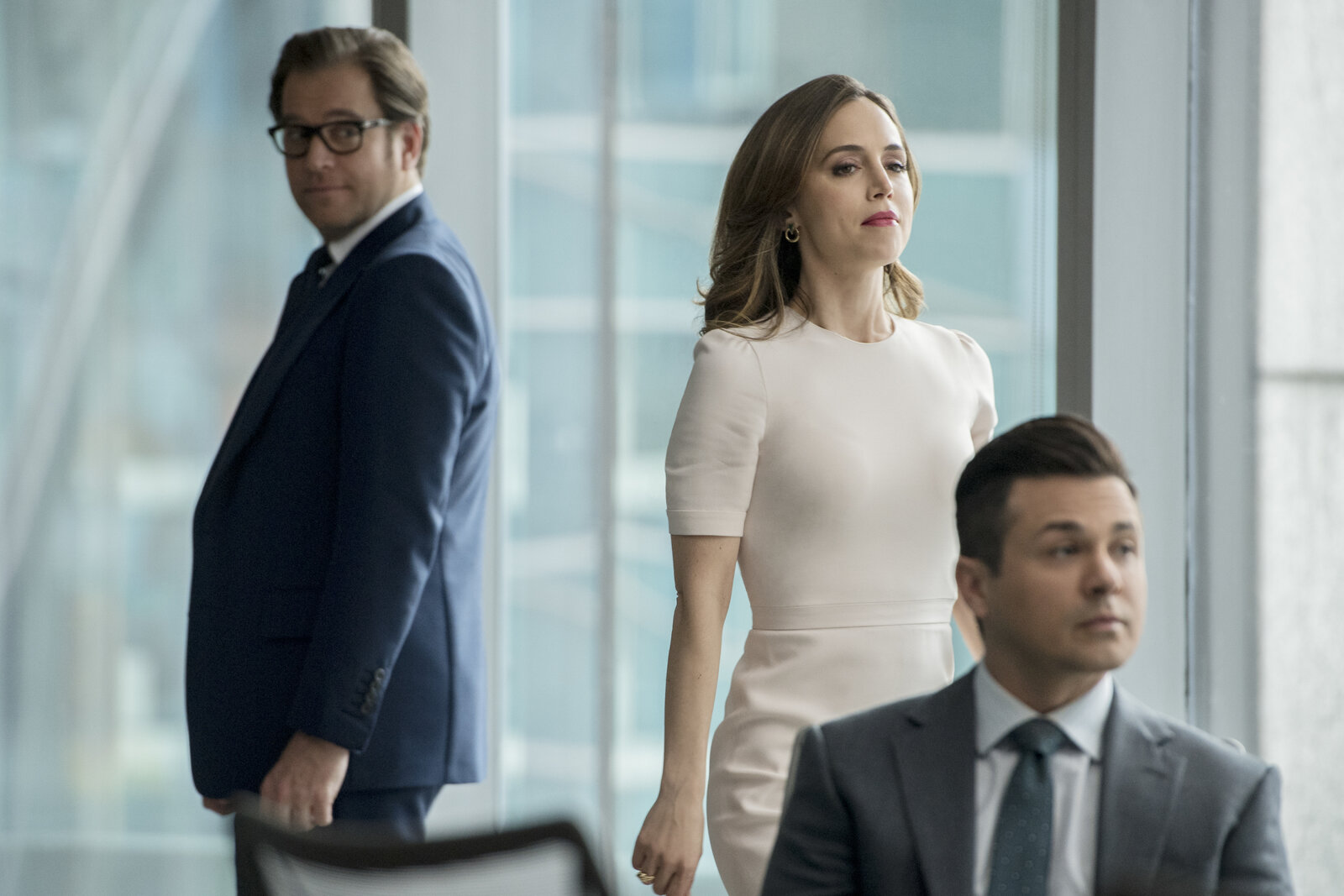 Gott hatte andere PläneAls sein Freund Benny (Freddy Rodriguez, r.) ihn wegen Fehlverhaltens in seinem alten Job bei der Staatsanwaltschaft anklagt, willigt Bull (Michael Weatherly, l.) ein, für diesen speziellen Fall die knallharte Anwältin J.P. Nunnelly ((Eliza Dushku, M.) zu engagieren ...Bild: © 2016 CBS Broadcasting, Inc. All Rights Reserved
