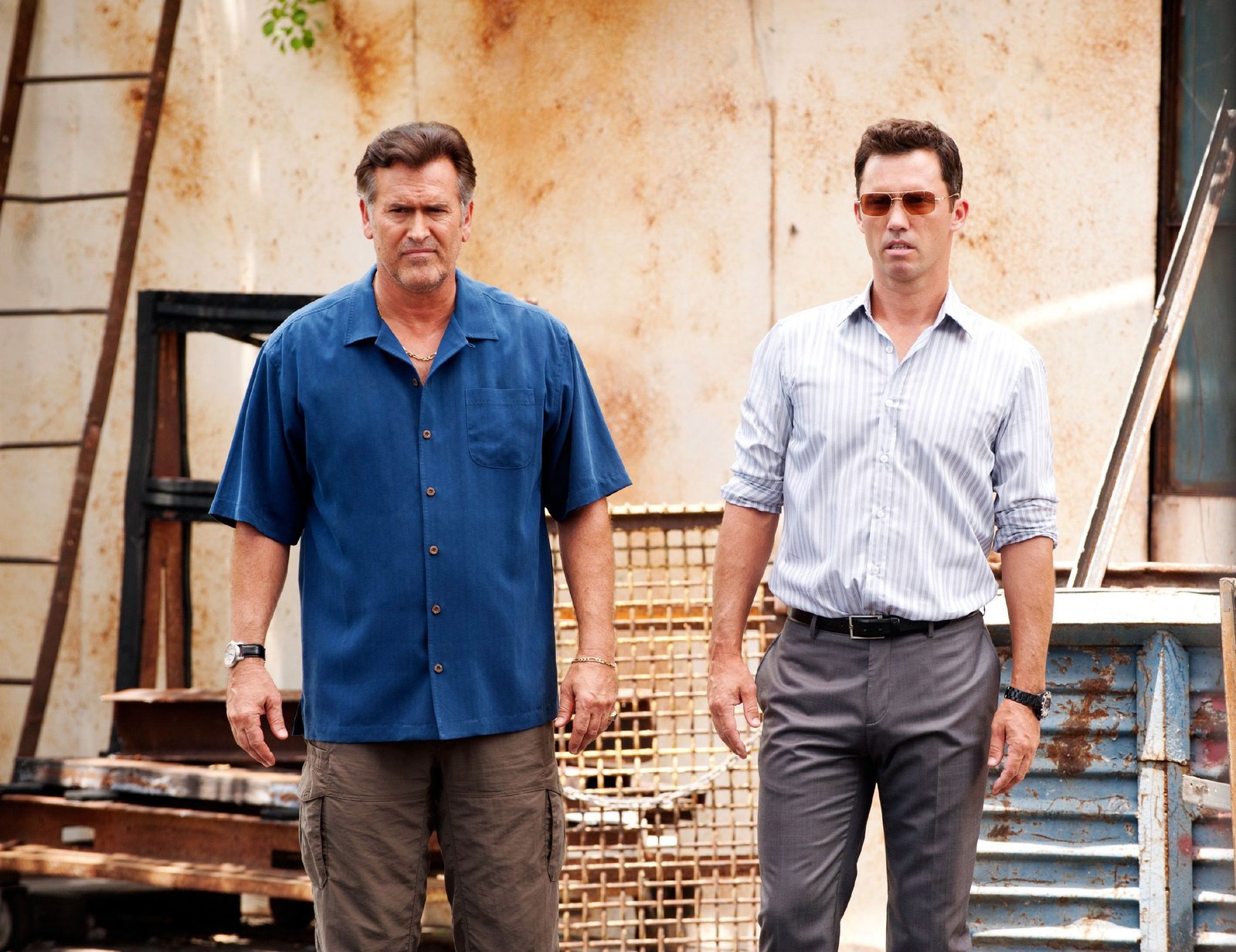 DruckwelleBarry (Paul Tei, r.), ein Klient, taucht überraschend bei Sam (Bruce Campbell) auf und benötigt dringend dessen Hilfe. Ehemalige Waffenlieferanten haben es auf ihn abgesehen und ihn angeschossen.Bild: © RTL NITRO / USA Network