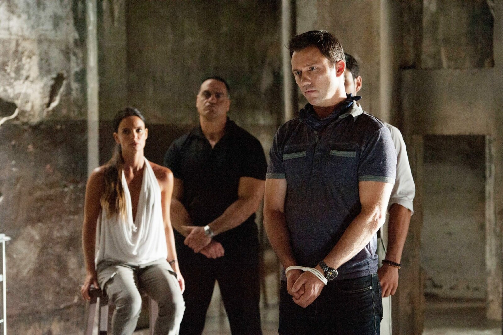 Quid pro quoV.l.: Fiona Glenanne (Gabrielle Anwar) und Jesse Porter (Coby Bell) erpressen den Bankangestellten George Anders (Simon Kassianides) mit Daten einer seiner kriminellen Kunden, um eine brisante Überweisung tätigen zu können. Doch wird es den beiden gelingen?Bild: © Nitro.