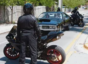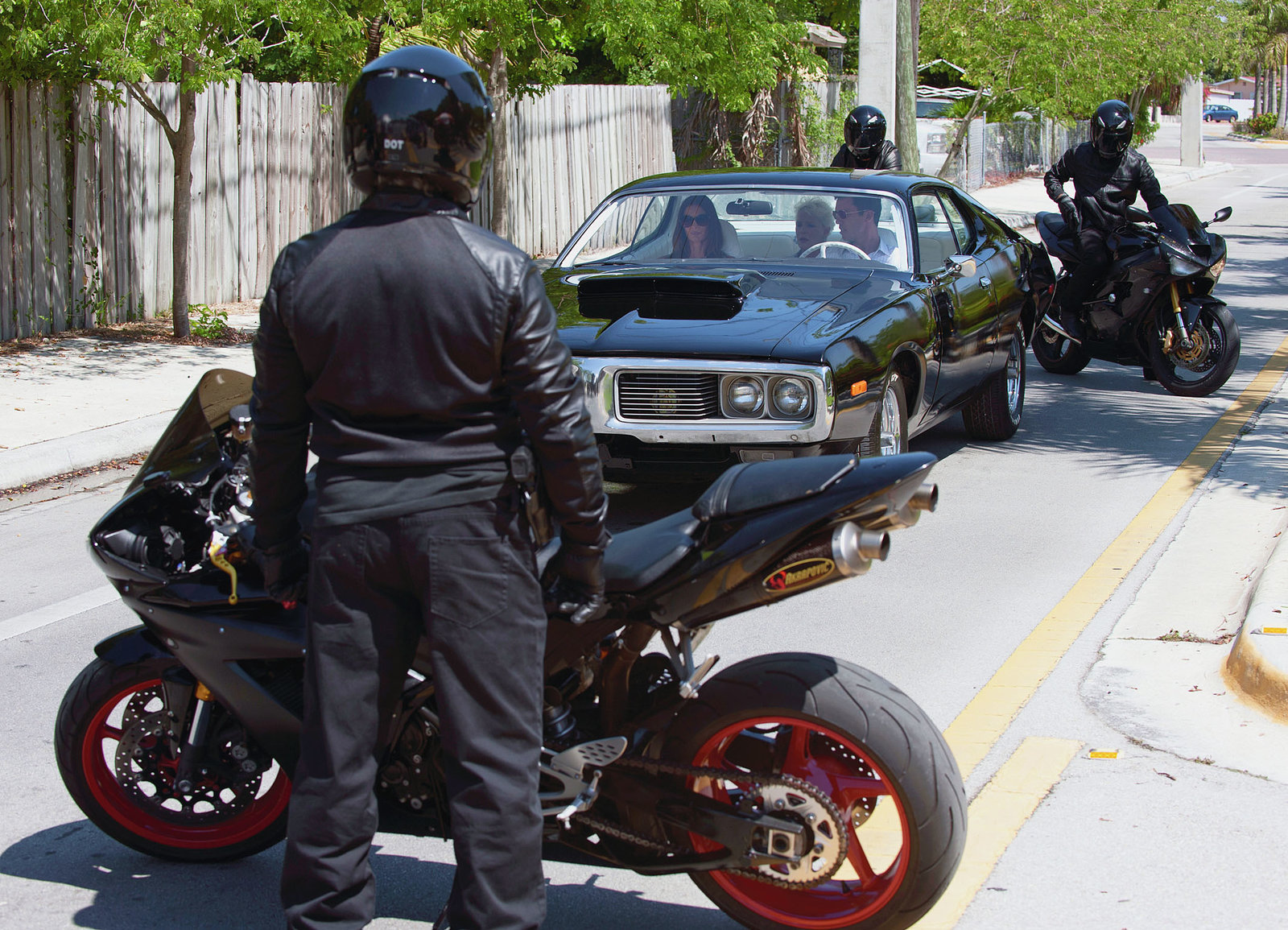Unter SöldnernVon Bikern umstellt: Gabrielle Anwar als Fiona Glenanne, Sharon Gless als Madeline Westen, Jeffrey Donovan als Michael Westen (alle im Auto)Bild: © SRF/Twentieth Century Fox Television Distribution