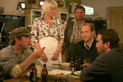 Butter bei die FischeInge (Gerburg Jahnke, 2.v.l.) betrachtet kritisch die Männerrunde: Bauer Heinrich (Bjarne Mädel, l.), Gastwirt Knud (Jan-Peter Heyne, M.), Pastor Hans-Uwe Petersen (Peter Heinrich Brix, 2.v.r.) und Bauer Fiedje (Jens Münchow, r.).Bild: © ZDF und Manju Sawhney