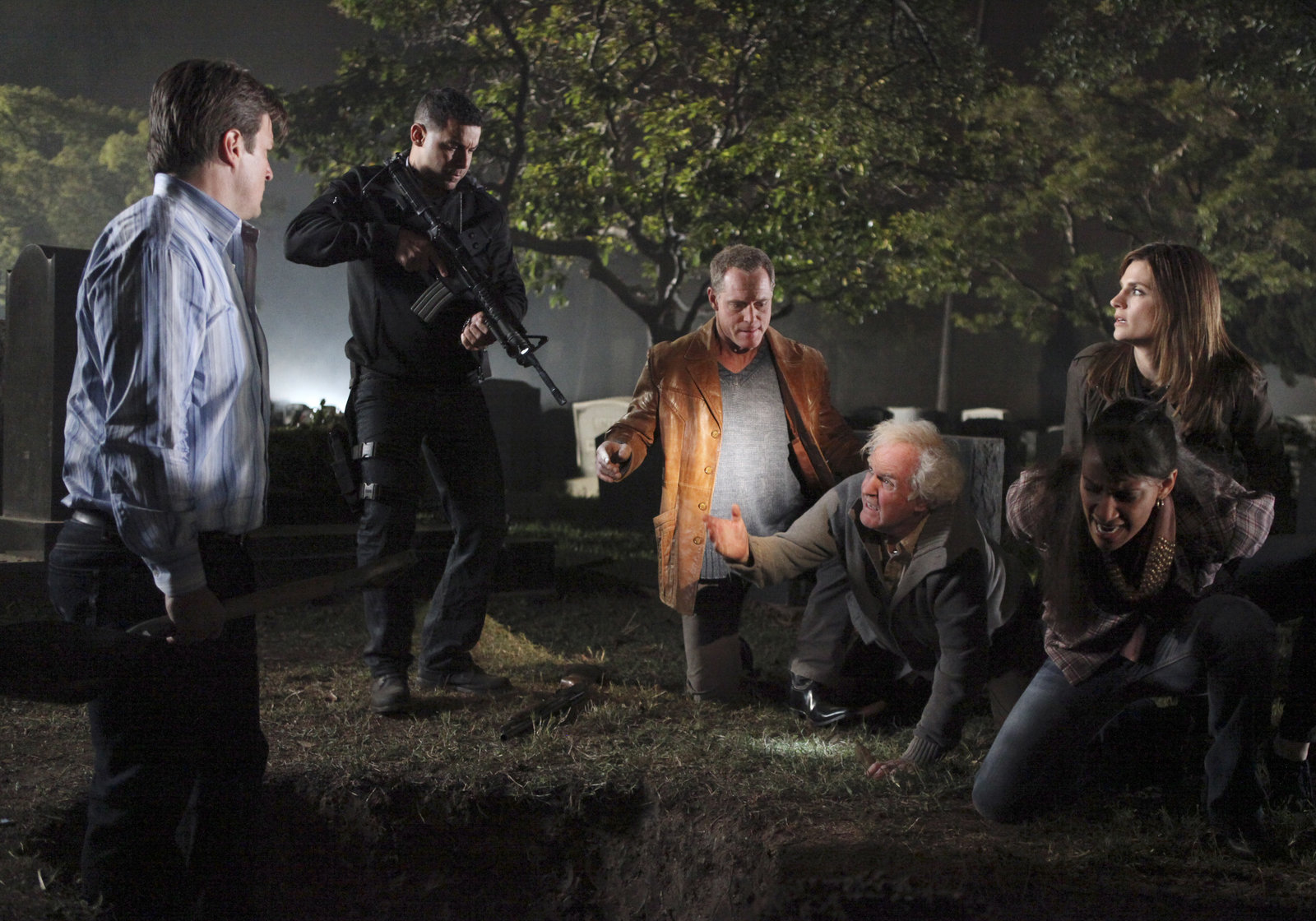 Die SchatzkarteL-R: Richard Castle (Nathan Fillion), Javier Esposito (Jon Huertas), Mike Royce (Jason Beghe), Clifford Stuckey (James Handy), Kate Beckett (Stana Katic), Brooke Carver (Sophina Brown)Bild: © Universal TV