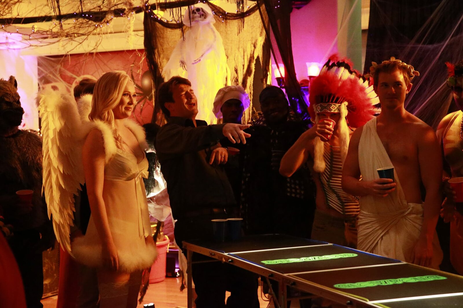 Campus-KillerUndercover als Professor und Studentin im Engelskostüm, machen Castle (Nathan Fillion, 2.v.l.) und Alexis (Molly C. Quinn, l.) das Campusleben unsicher, um einen Mordfall aufzudecken ...Bild: © Universal TV