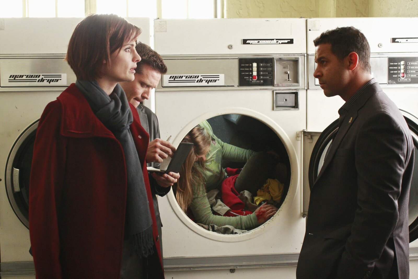 Die tote NannyDie Leiche der Nanny Sara Manning (Mandy Kowalski, 2.v.r.) befindet sich noch immer im Wäschetrockner. Kate (Stana Katic, l.), Kevin (Seamus Dever, 2.v.l.) und Javier (Jon Huertas, r.) gehen auf Spurensuche.Bild: © Universal TV