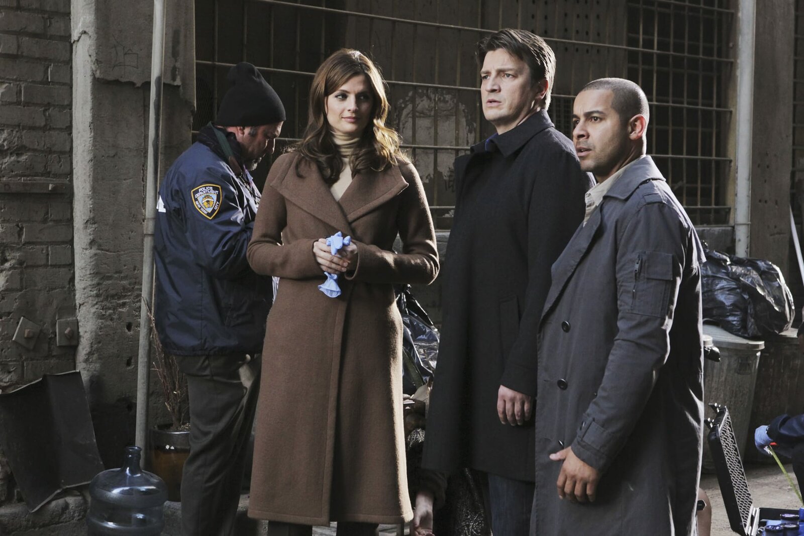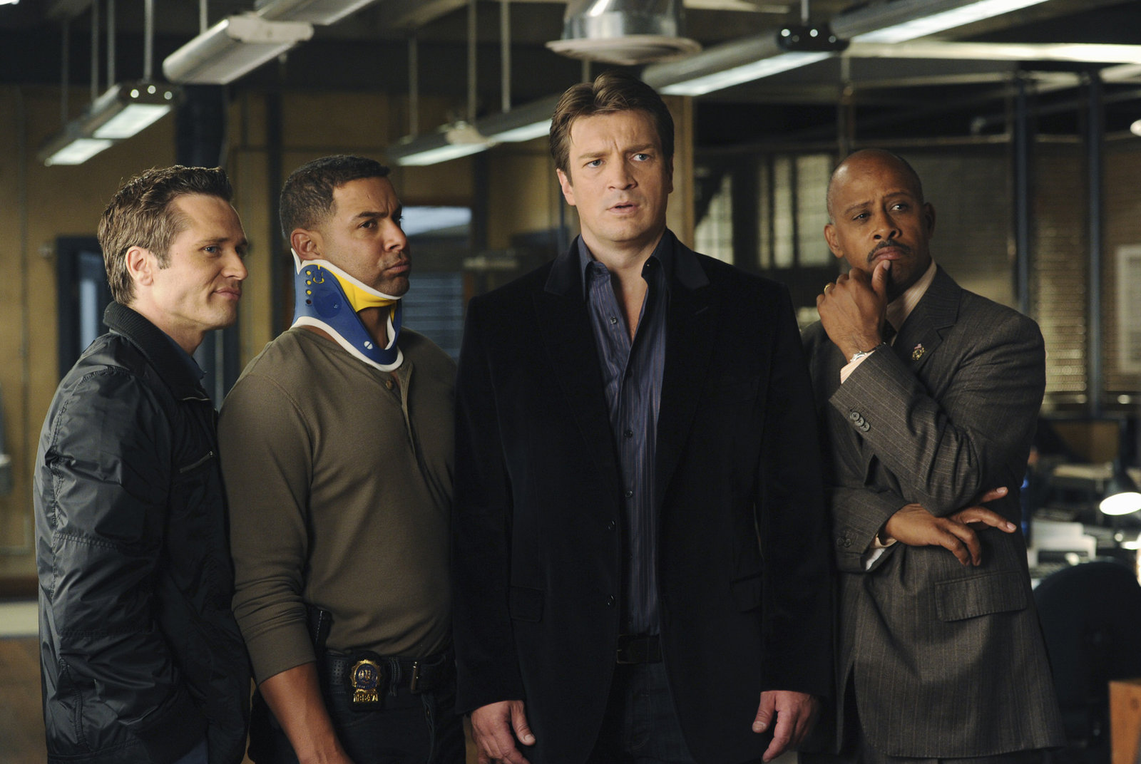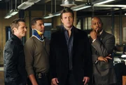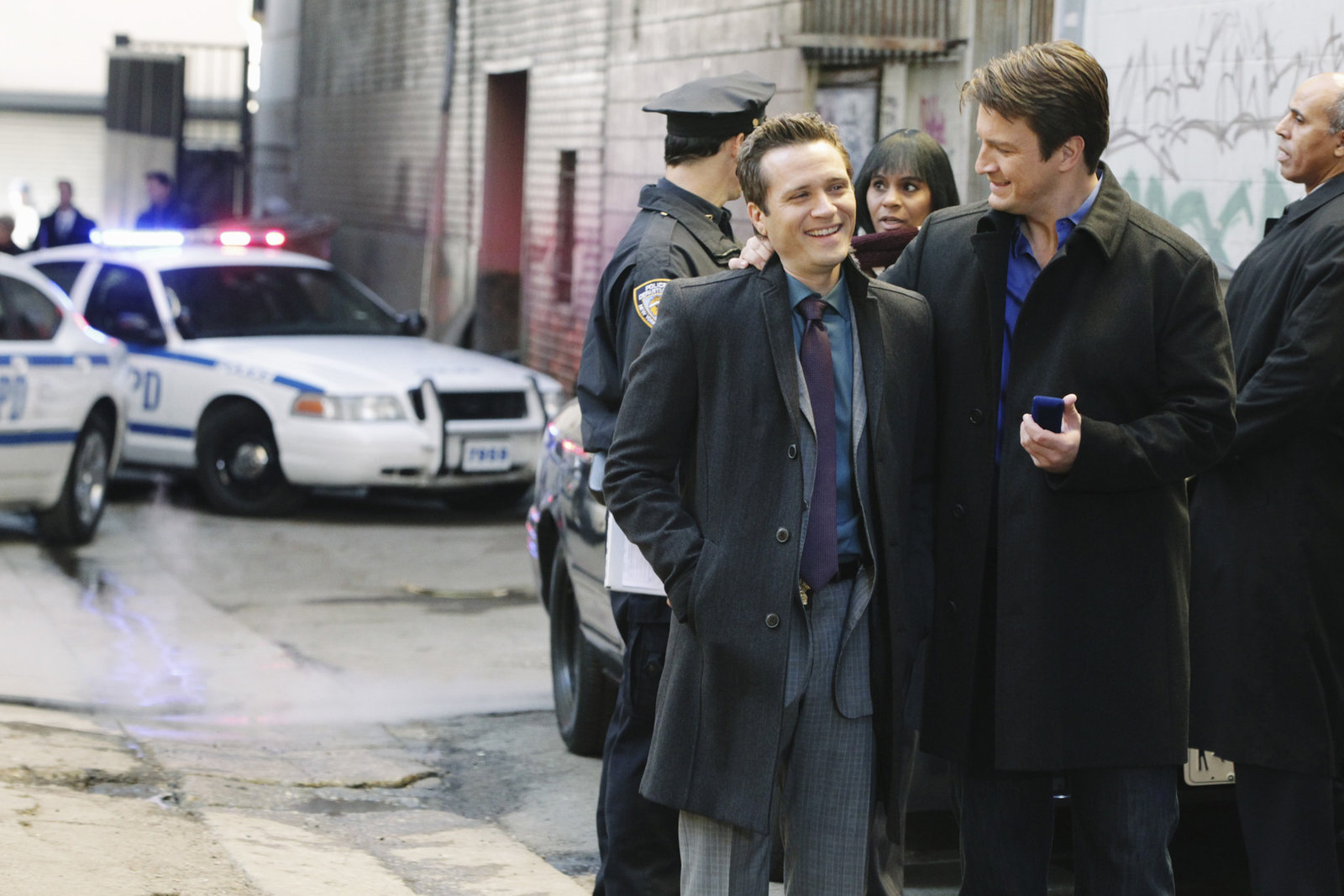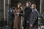 Nikki HeatAm Tatort wartet auf Richard Castle (Nathan Fillion, 2.v.r.) und Javier Esposito (Jon Huertas, r.) eine Überraschung von der Kate Beckett (Stana Katic, 2.v.l.) ganz offensichtlich bereits wusste ...Bild: © Universal TV