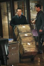PandoraJones (Russell Edge, M.) bringt Beckett (Stana Katic, r.) und Castle (Nathan Fillion, l.) in ein Geheimversteck der CIA ...Bild: © Universal TV