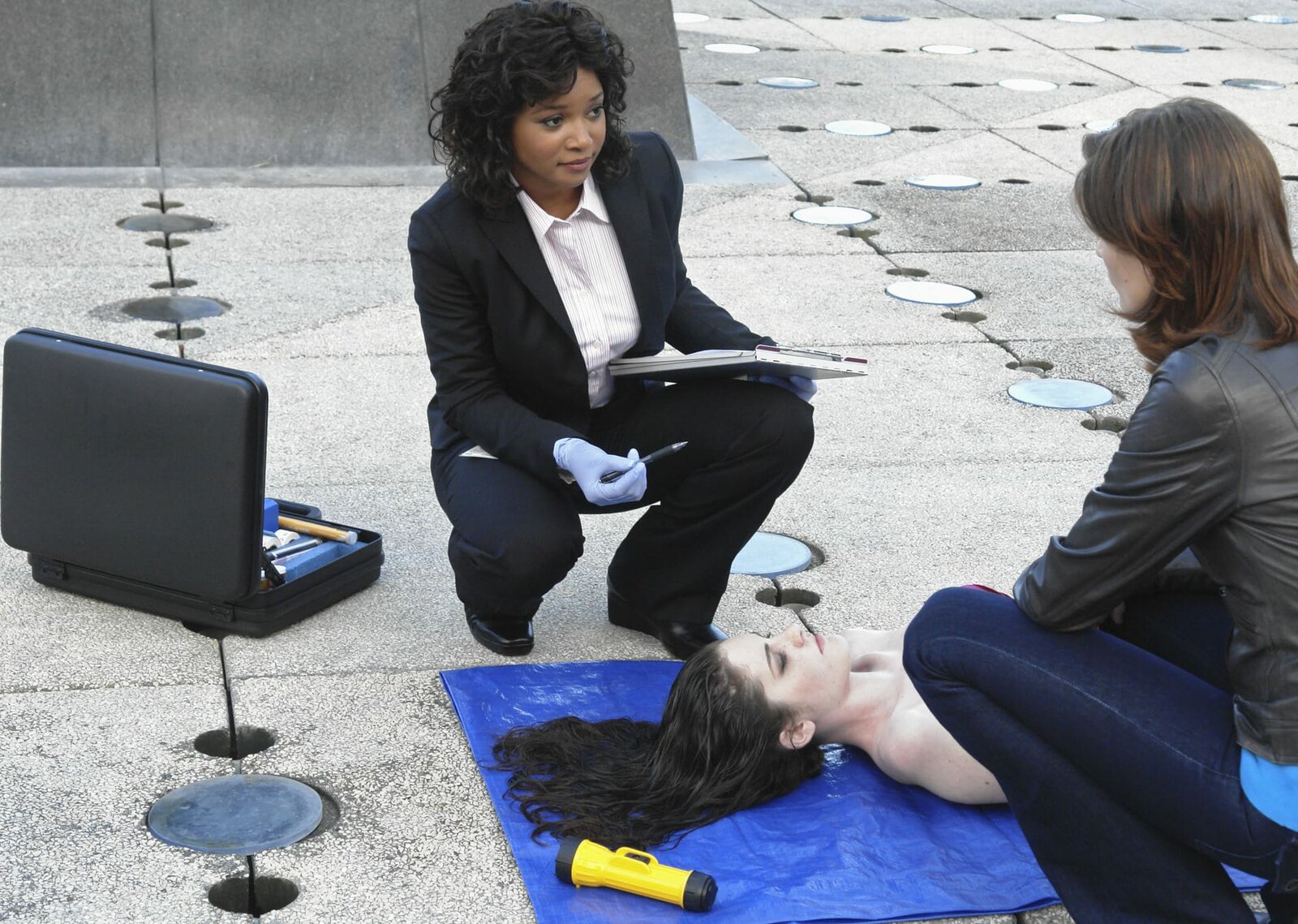 Gefrorenes BlutAuf einer Baustelle wird die hartgefrorene Leiche von Melanie Kavanaugh (Tammy Baird, r.) gefunden. Lanie Parish (Tamala Jones, l.) untersucht den leblosen Körper.Bild: © Universal TV
