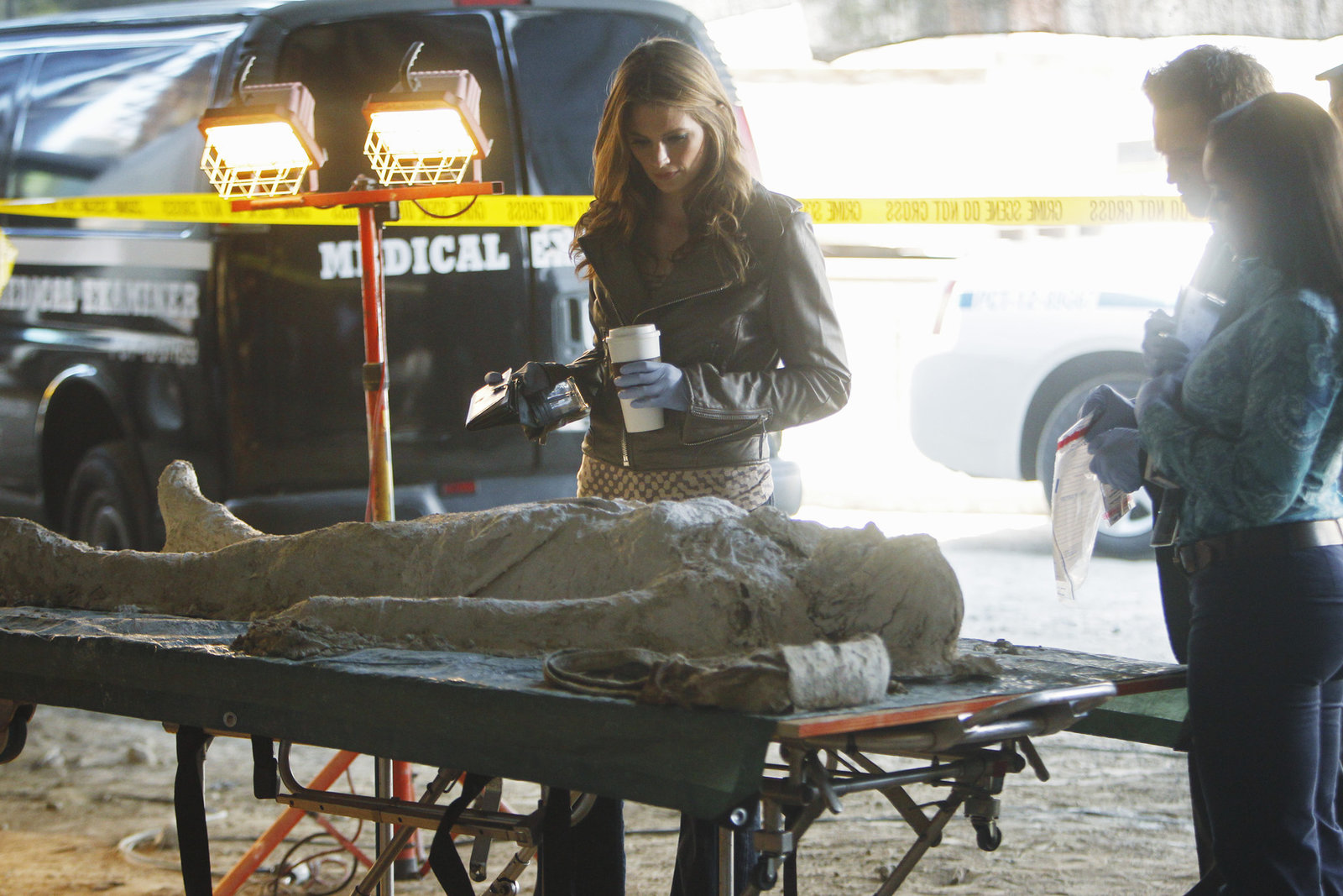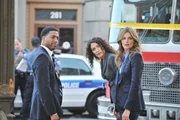 B für BürgermeisterDie Telefonsexarbeiterin Laura Cambridge wird erwürgt in einem Wagen aus dem Fuhrpark des Bürgermeisters aufgefunden. Beckett (Stana Katic, l.), Castle (Nathan Fillion, M.) und Esposito (Jon Huertas, r.) übernehmen den Fall.Bild: © Universal TV