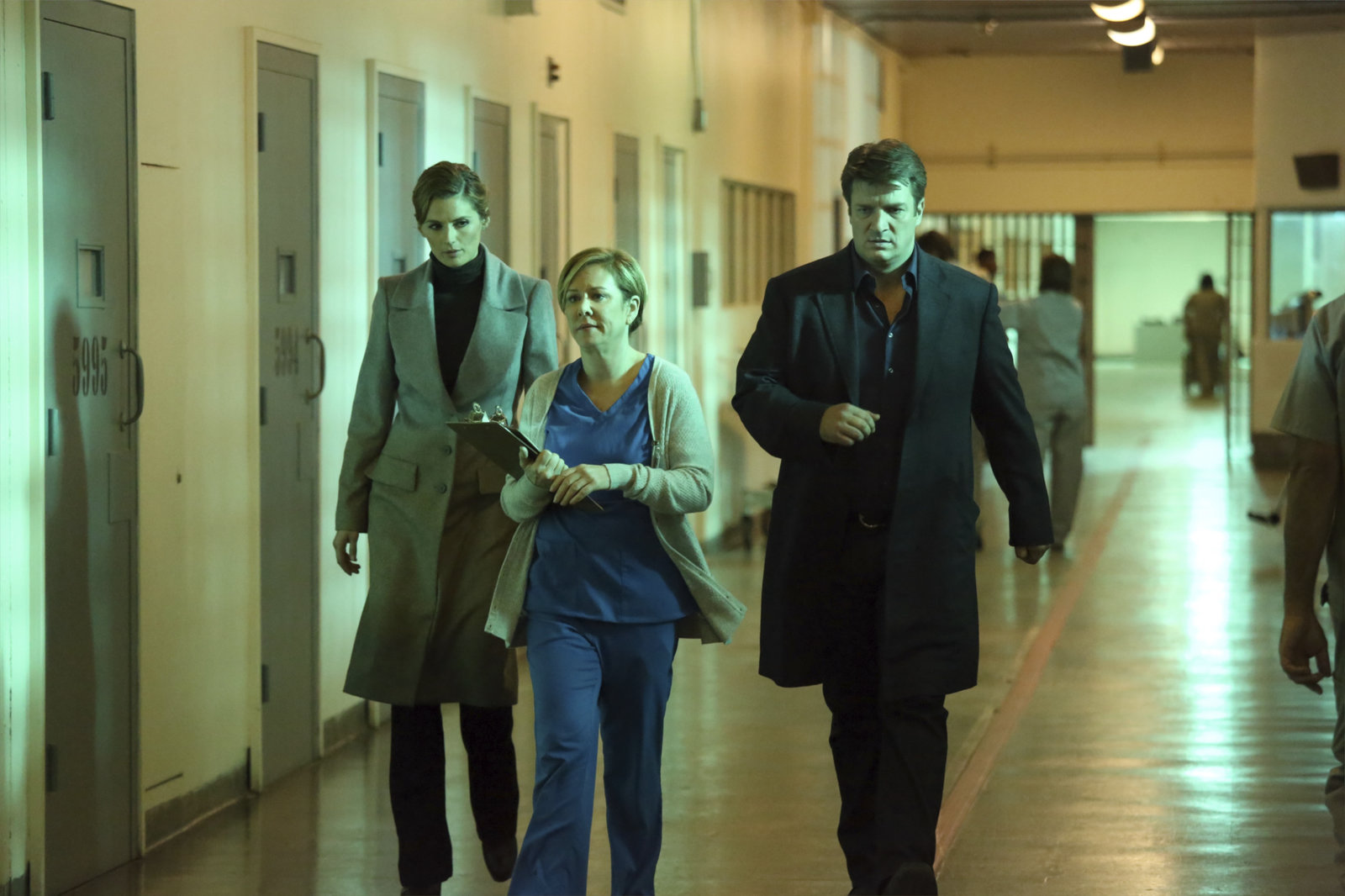Zu Tode erschrecktL-R: Kate Beckett (Stana Katic), nurse Lockhart (Romy Rosemont), Richard Castle (Nathan Fillion)Bild: © Universal Channel