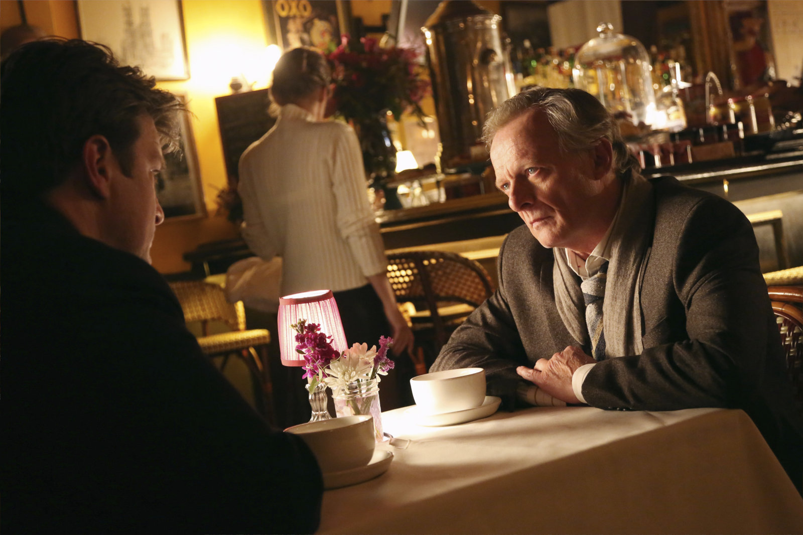Entführt (1)Castle (Nathan Fillion, r.) macht sich Sorgen um seine Tochter Alexis, weil er sie auf dem Handy nicht erreichen kann. Kate (Stana Katic, l.) versucht ihn zu beruhigen ...Bild: © Universal TV