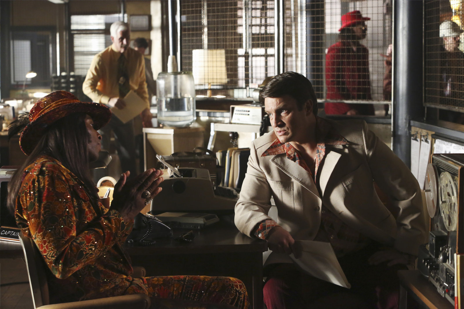 Zeitreise in die SiebzigerShow" - When construction workers find the body of an infamous New York mobster who disappeared in the seventies, Beckett and Castle try to solve this three decade-old Mafia hit. Unfortunately, their only witness is a man who thinks it's still the 1970's, so to uncover what he knows, they must play into his delusion, and party like it's the last days of disco, on "Castle," MONDAY, APRIL 21 (10:01-11:00 p.m., ET) on the ABC Television Network. (ABC/Danny Feld) DRE MICHAEL CHANEY, NATHAN FILLIONBild: © Universal Channel