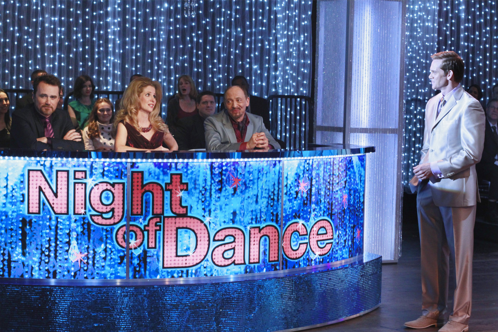 Tanz mit dem TodMax Renfro (Tim Ransom, l.), Pam Francis (Lauralee Bell, 2.v.l.) und Pierre Dubois (Braeden Marcott, 2.v.r.) sitzen in der Jury der beliebten Tanzshow "A Night of Dance", die von Brad Melville (Adam Harrington, r.) moderiert wird ...Bild: © Universal TV