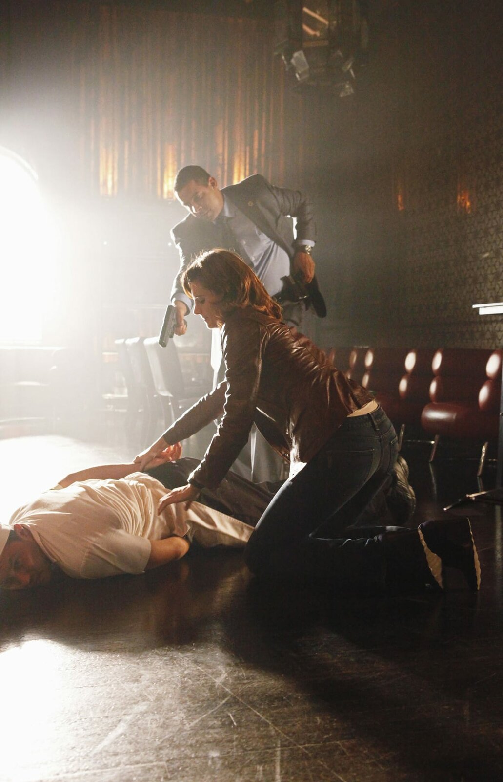Wenn der Ast brichtJavier Esposito (Jon Huertas, hinten) und Kate Beckett (Stana Katic, r.) haben einen Verdächtigen (Ivo Nandi, liegend) zur Strecke gebracht.Bild: © Universal TV