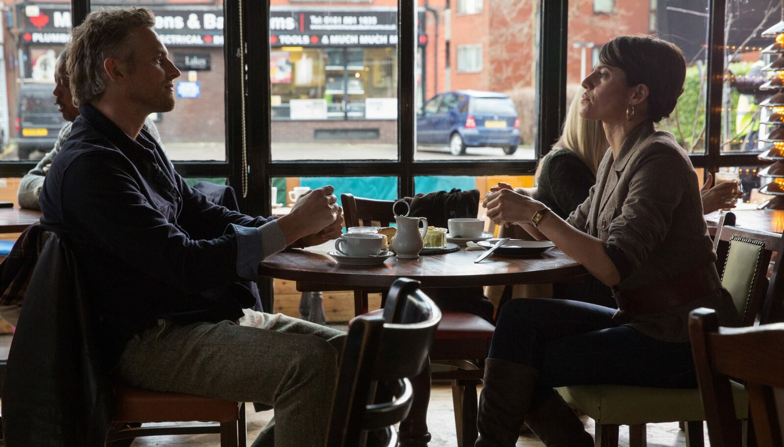 Der BeobachterGillian Ward (Karolin Eichhorn) hat ein Verhältnis mit dem Handballtrainer John Burton (Andreas Pietschmann).Bild: © rbb/ARD Degeto/UFA/Wolfgang Aichholzer
