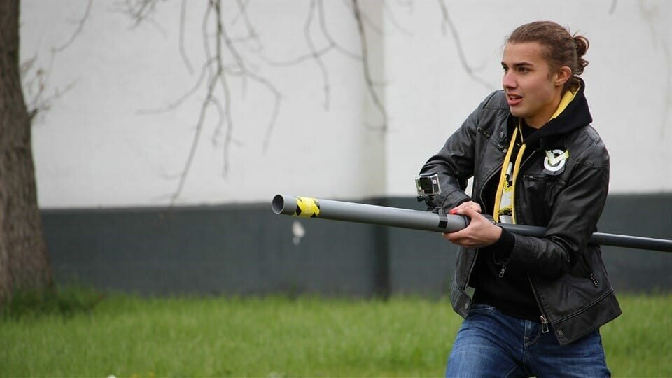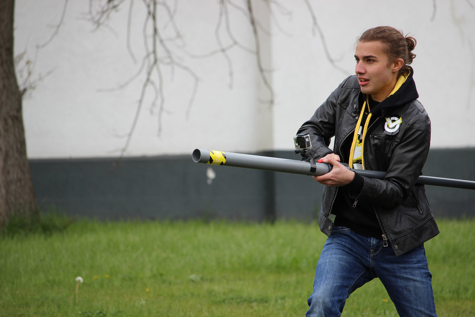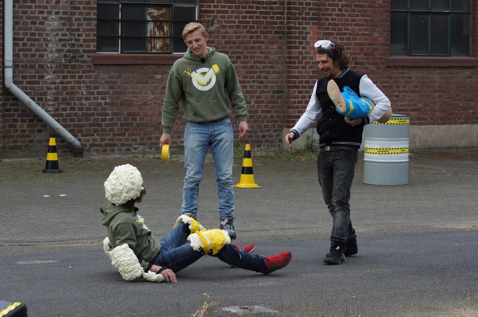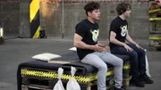 Folge 21Schaum verhindert blaue Flecken. Leopold, David und Moderator Tommy Scheel testen selbstgebaute Protektoren aus Montageschaum.Bild: © ZDF/Sina Klaus
