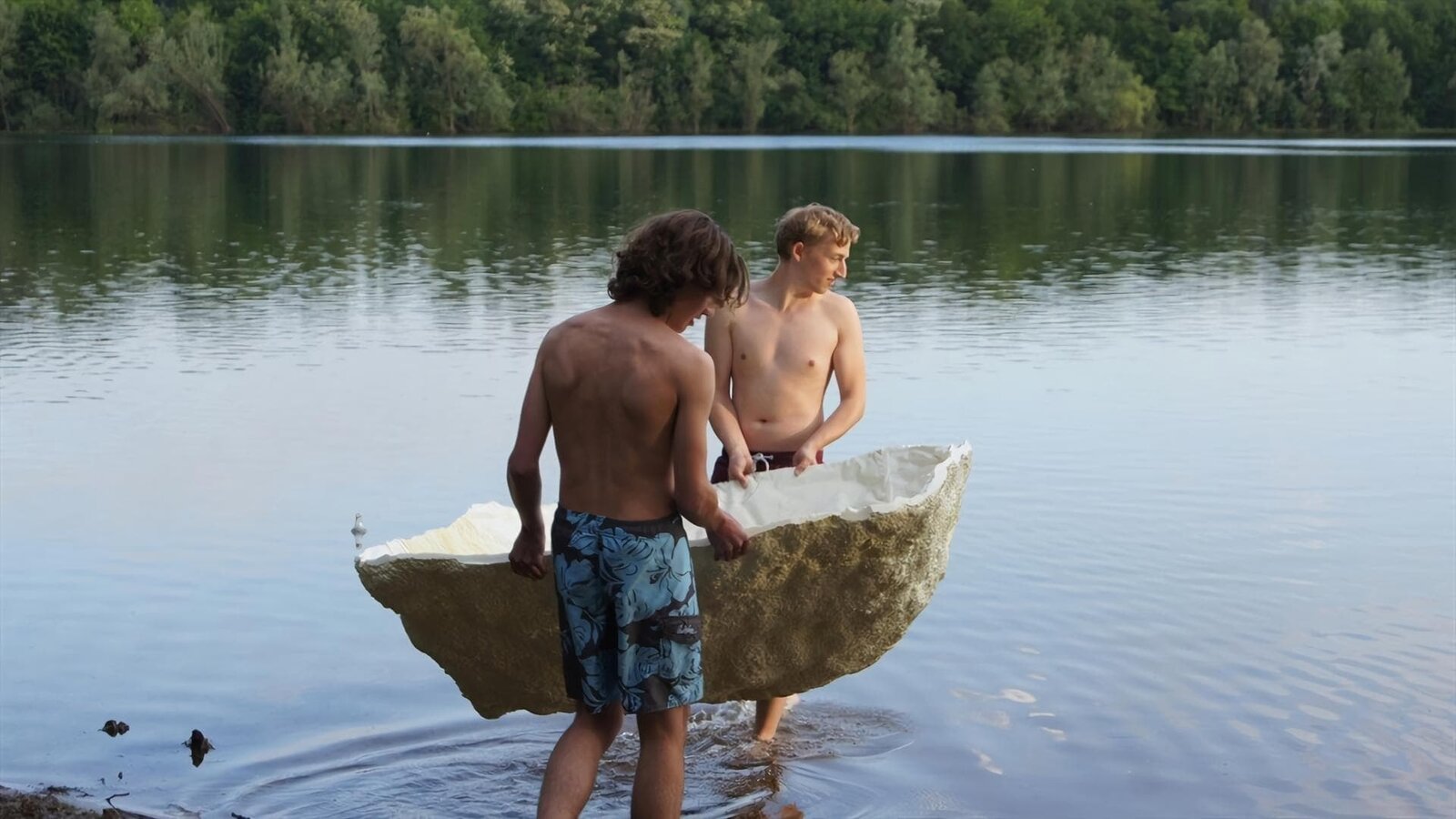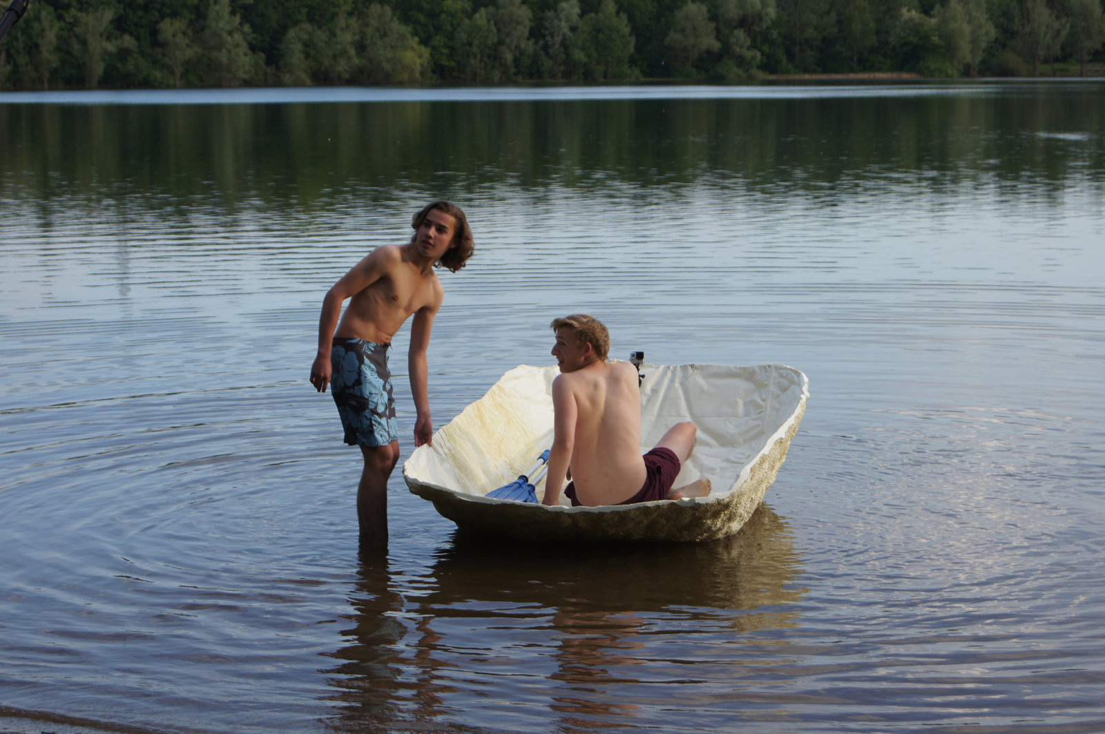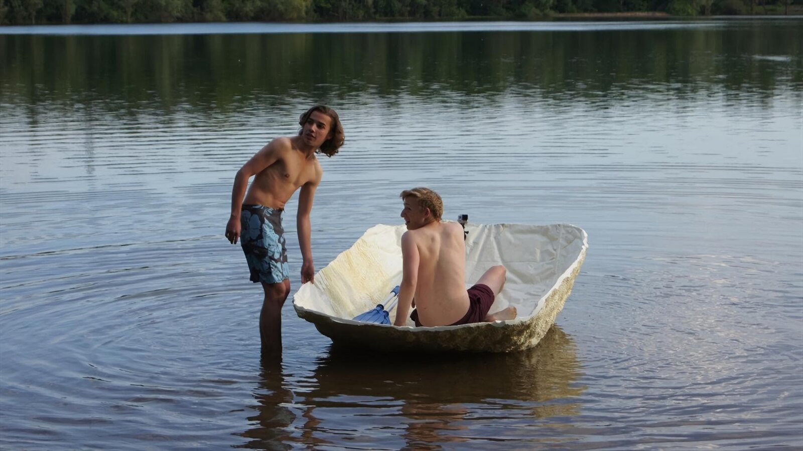 Folge 21Wo bleiben die Rettungsringe? Leopold und David testen ihr selbstgebautes Boot aus Montageschaum.Bild: © ZDF/Sina Klaus